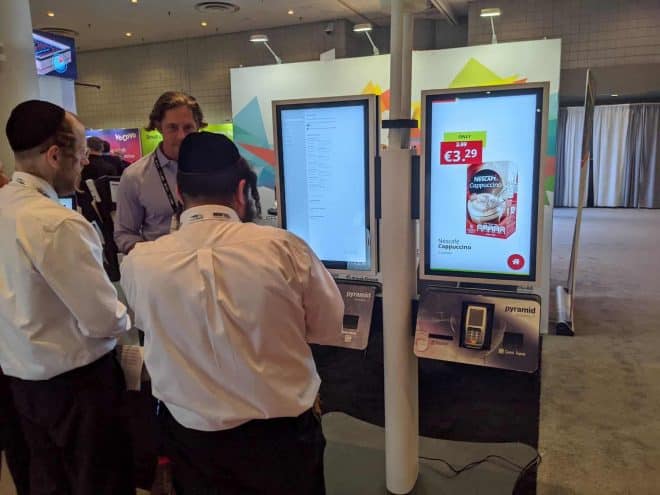 - Three people stand in front of two large interactive kiosks at an exhibition. One displays a list, while the other features a Nescafe Cappuccino ad priced at €3.29. Amidst the bustling space reminiscent of NRF 2020, products and stands are visible in the background.