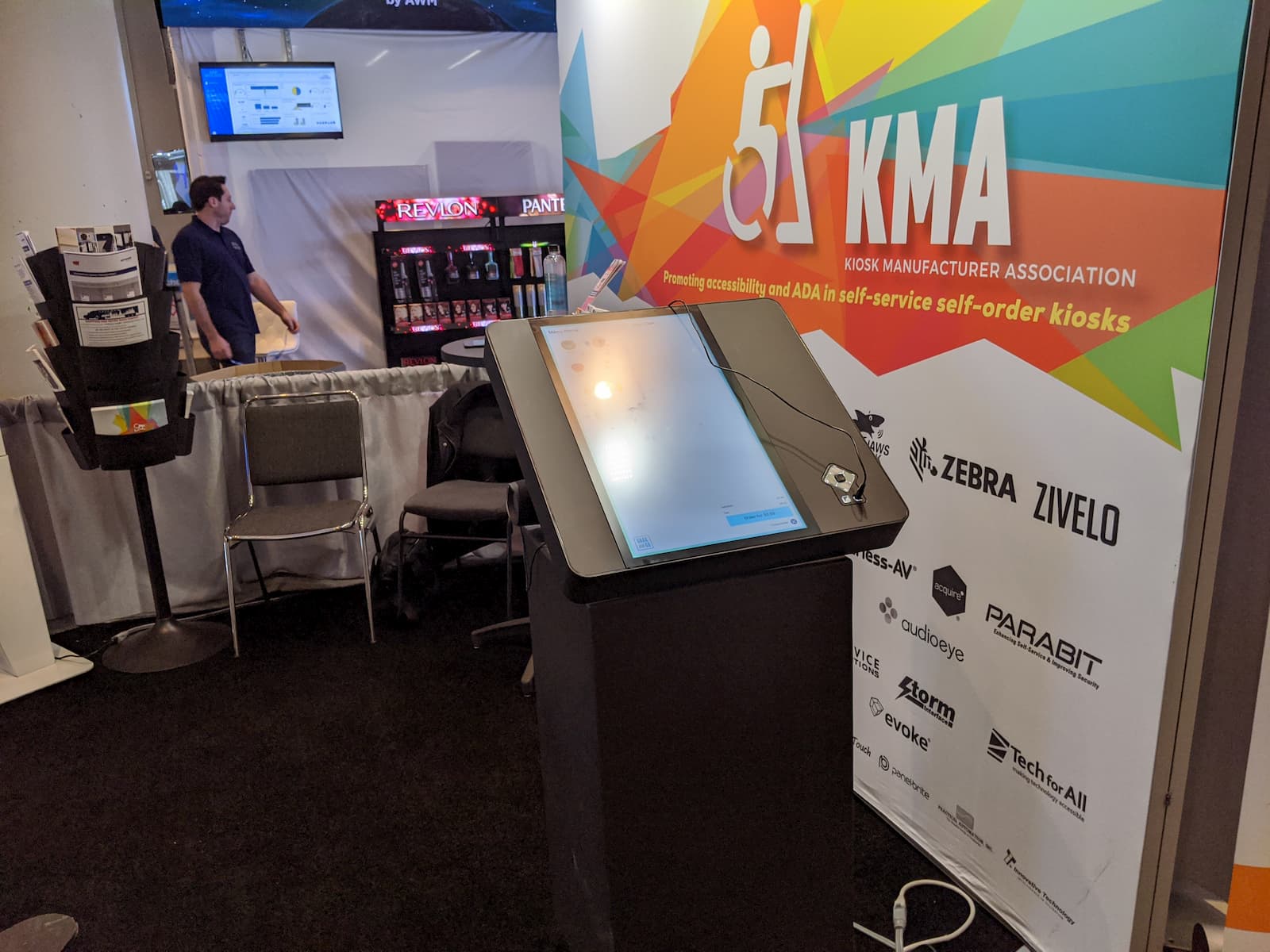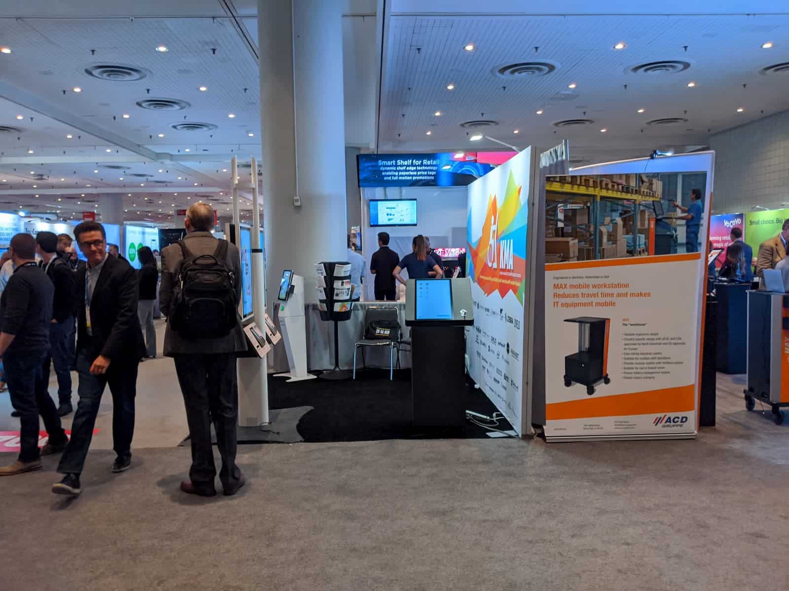 - A person is standing behind a kiosk, reminiscent of those showcased at NRF 2020, near a colorful banner with the text KMA and an accessibility icon. Various logos are displayed at the bottom, suggesting an indoor event space bustling with activity.