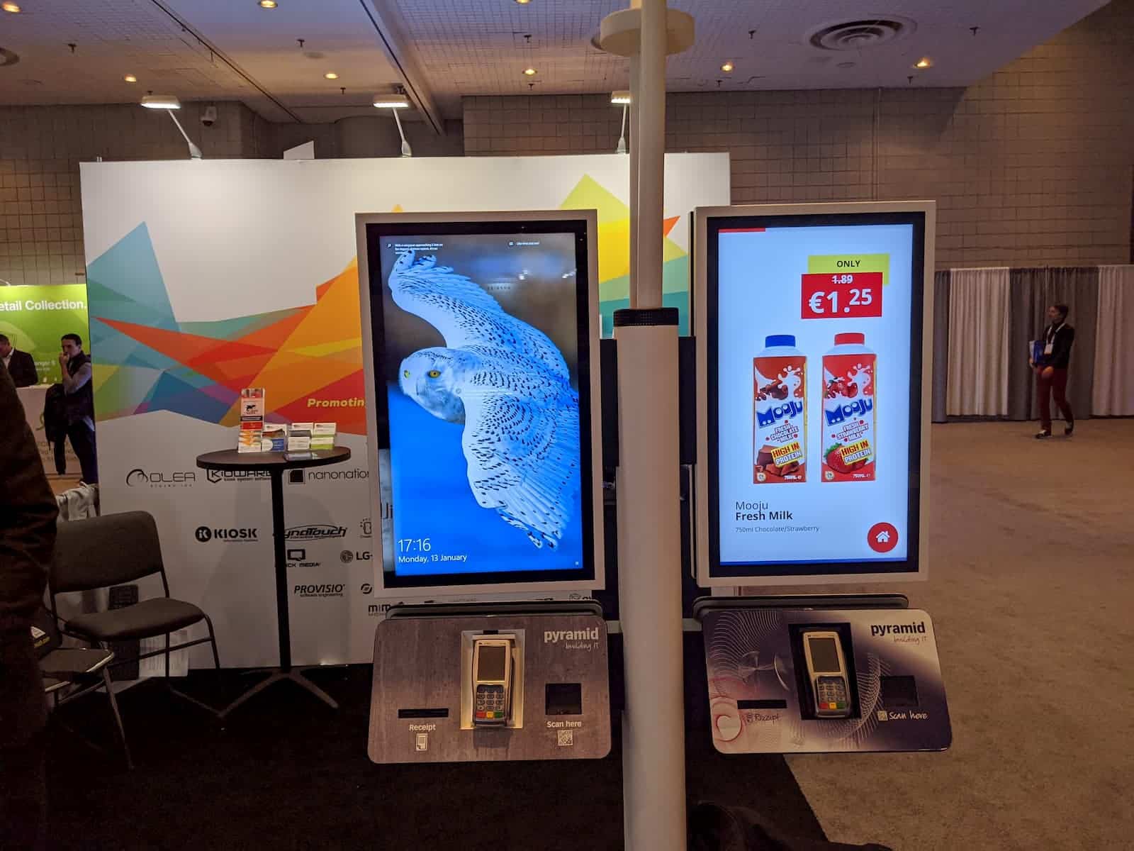 - Two digital display kiosks in an event space nod to Kiosk NRF 2020 innovation. The left screen shows a snowy owl, while the right advertises Moofej Fresh Milk for €1.25. The booth is adorned with branded backdrops, and payment terminals are seamlessly integrated into the stands.