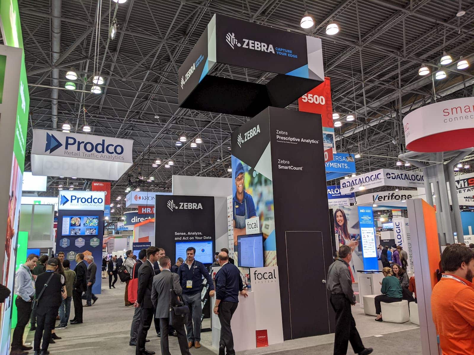 - Attendees at a bustling technology trade show navigate the large exhibition hall. Among the various company booths, including Zebras, interactive kiosks and display screens capture attention. Engaged visitors explore exhibits, reminiscent of the innovative spirit seen at NRF 2020.