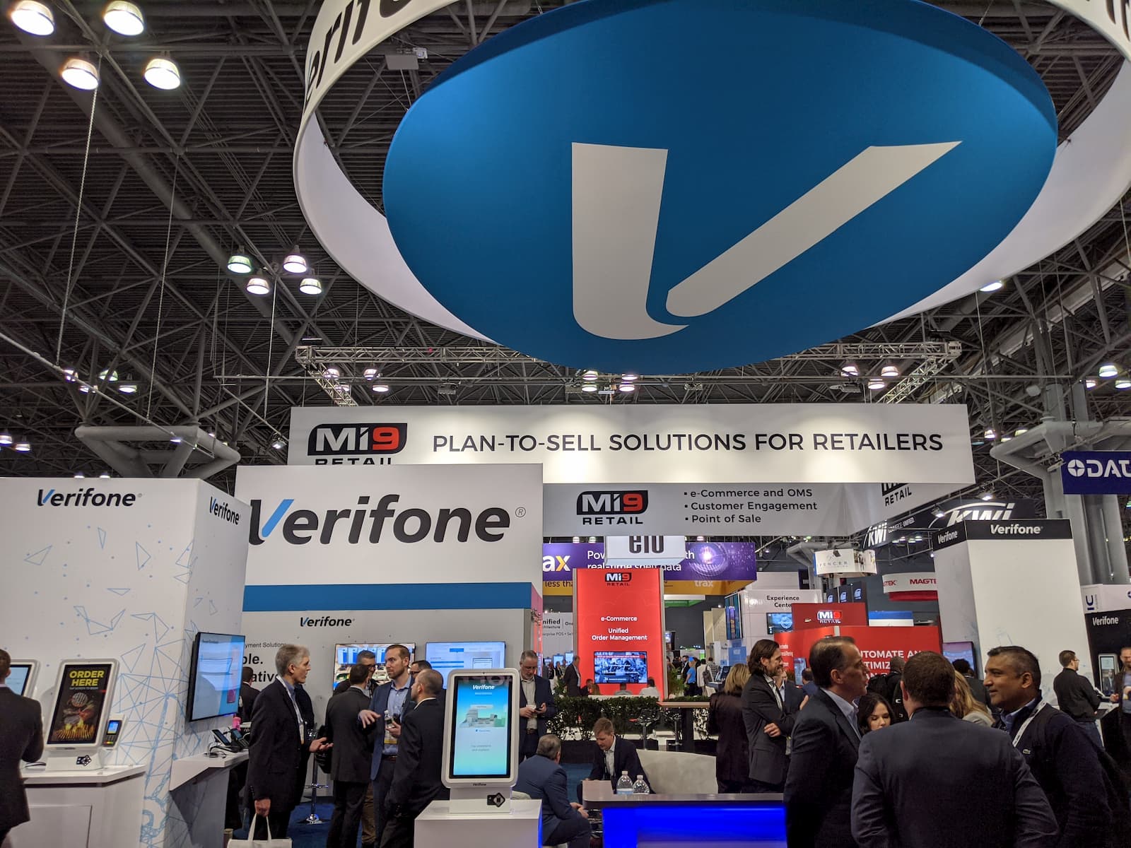 - People gather around booths at a trade show, with the Verifone display standing out, showcasing digital screens in a blue and white color scheme. An overhead sign highlights MI9 Retail Plan-to-Sell Solutions for Retailers at Kiosk NRF 2020.