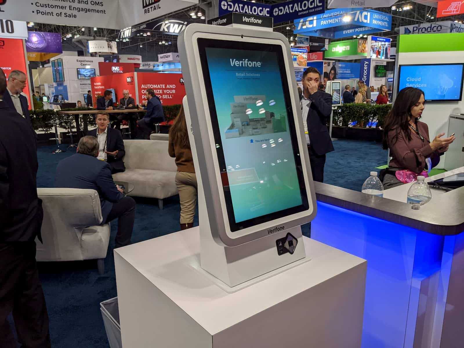 - A large touchscreen display with Verifone Retail Solutions text stands on a white platform at the bustling NRF 2020 trade show. People are seated and walking around the kiosk, with various company logos visible in the background, creating a dynamic business environment.