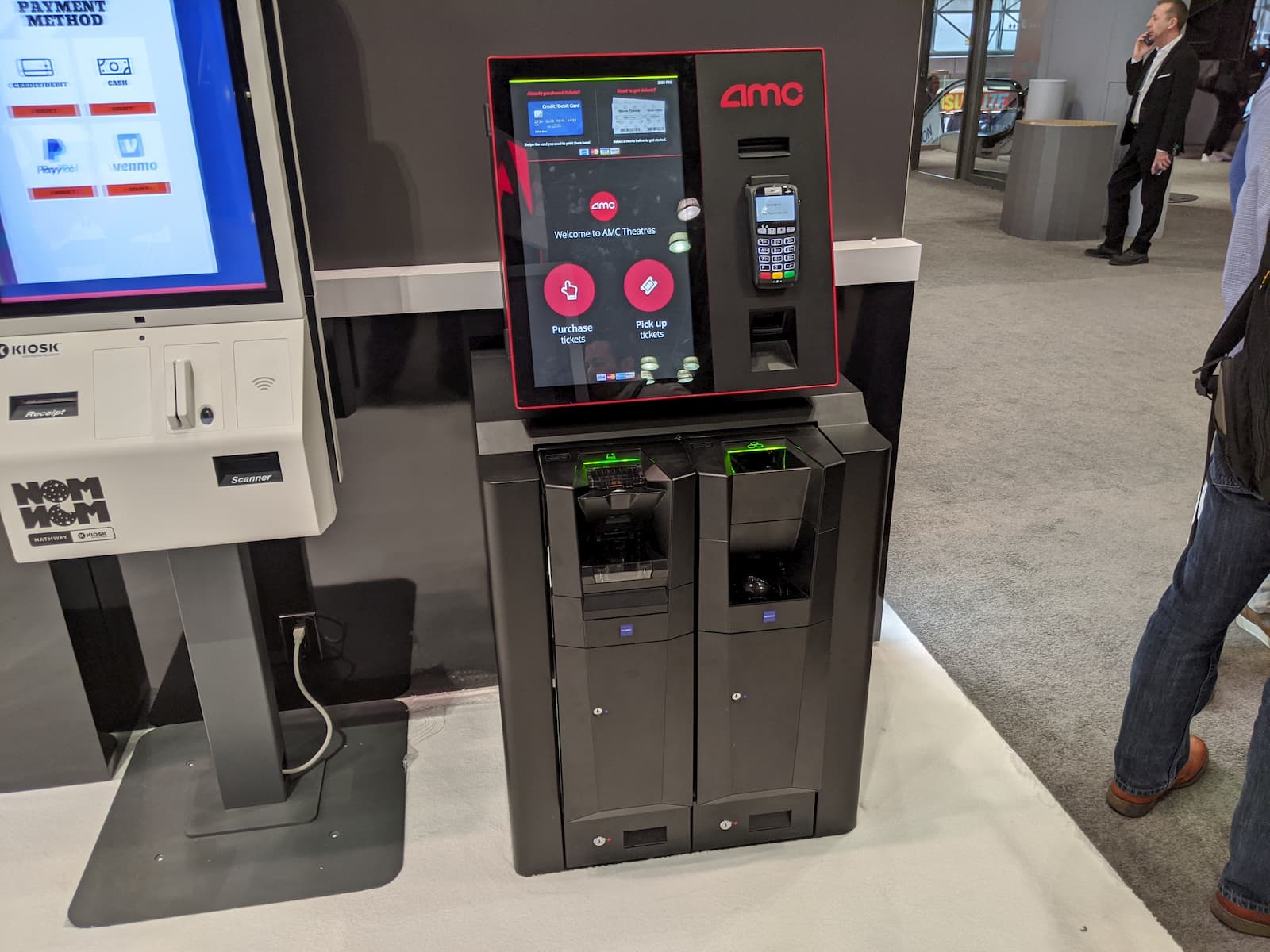 - An AMC ticket kiosk, reminiscent of those showcased at Kiosk NRF 2020, features a touchscreen display with menu options and a card terminal. It includes slots for payments and ticket dispensing. Nearby, a digital kiosk and a person are partially visible in the background.