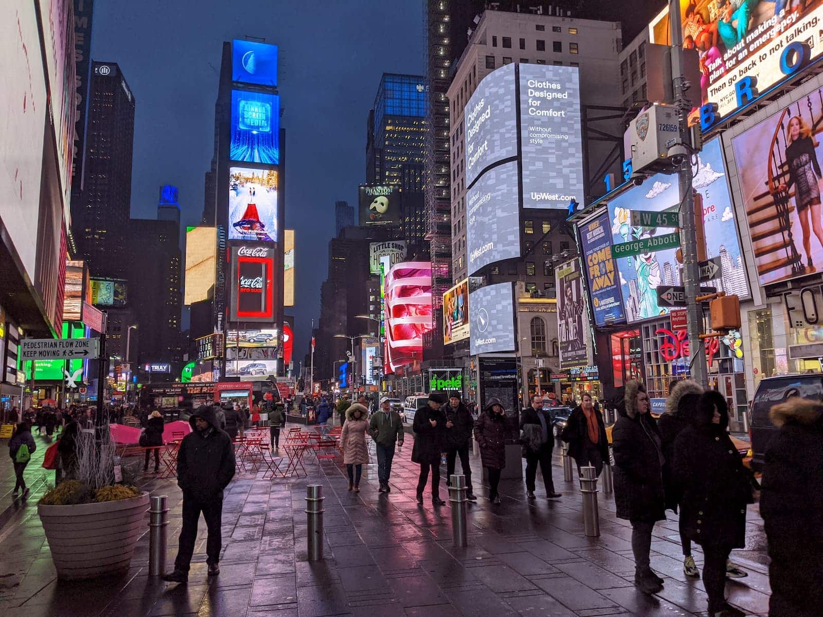 - A bustling night scene in Times Square, New York City, unfolds with people wandering past kiosks amid the glow of bright billboards. Illuminating logos for Coca-Cola and T-Mobile dominate the wet streetscape under the dark sky, echoing the vibrant energy of NRF 2020.