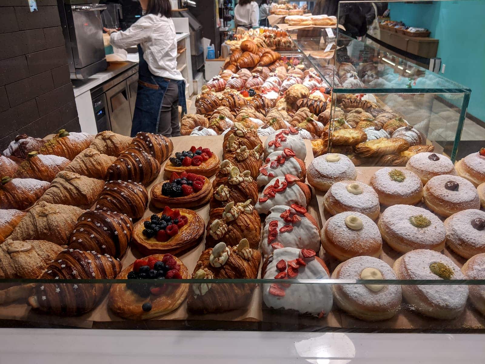 - A bakery kiosk reminiscent of NRF 2020 showcases a vibrant display filled with croissants, berry-topped danishes, powdered donuts, and other decorated treats. Behind the counter, someone expertly prepares an order, adding to the bustling atmosphere.