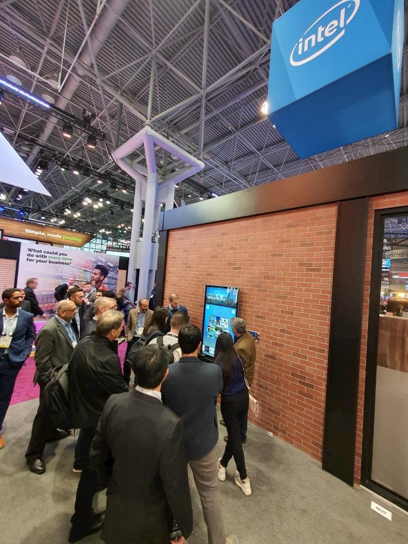 - A group of people gathers around a kiosk display screen at a tech exhibition. The brick wall behind the screen bears an Intel logo sign overhead. The event space, reminiscent of NRF 2020, features high ceilings with visible lights and structures.