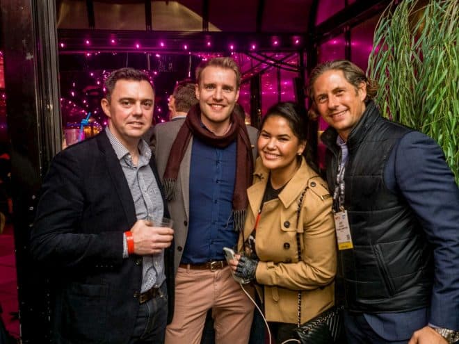 - Four people are smiling at a nighttime event with purple lighting, reminiscent of Kiosk NRF 2020. Three men and one woman stand together, dressed in jackets and holding drinks. A tall plant is visible on the right side, adding to the indoor venues ambiance.