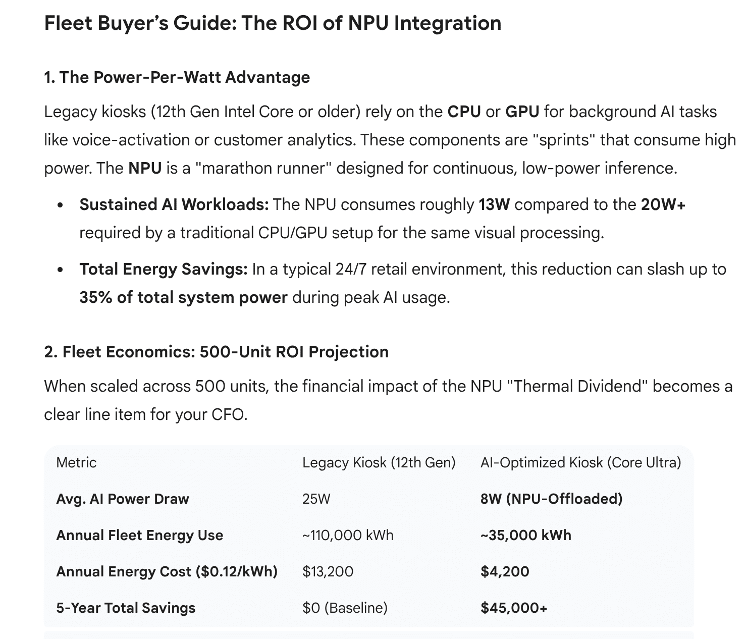 Integrating AI at the edge, especially with the newer Intel Core Ultra architecture, offers a significant “thermal dividend” that directly impacts the bottom line for kiosk operators.