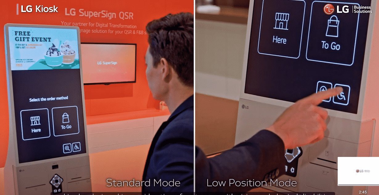 - A person engages with an LG kiosk showcasing two operating modes: Standard Mode, where a man chooses an order method, and Low Position Mode, featuring a close-up of a hand on the screen. Prominent LG logos sit at the top.