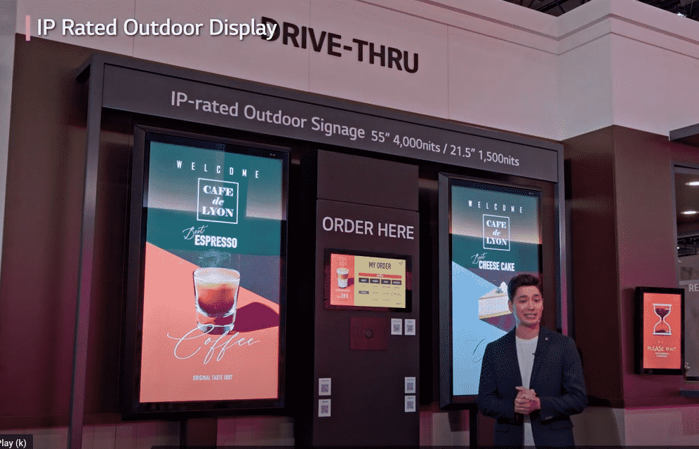 - A man in a suit stands next to two digital outdoor displays, including an LG Kiosk, at a drive-thru. The screens show advertisements for Cafe de Lion, featuring an espresso and cheesecake, with a control panel nestled between them.