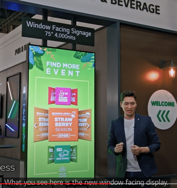 - A person stands before a large digital signage display featuring advertisements for a Strawberry Season event. The 75-inch, 4,000-nit screen with Window Facing clarity complements the LG Kiosk nearby. A welcoming sign adorns the wall.