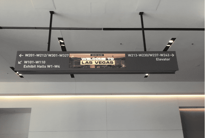 - Ceiling-mounted sign in an airport terminal, adorned with an LED wall. It directs travelers: W201-W212, W301-W327 to the left; W101-W110, Exhibit Halls W1-W4 straight; and W213-W230, W237-W243, Elevator to the right. Displays Welcome to Las Vegas.