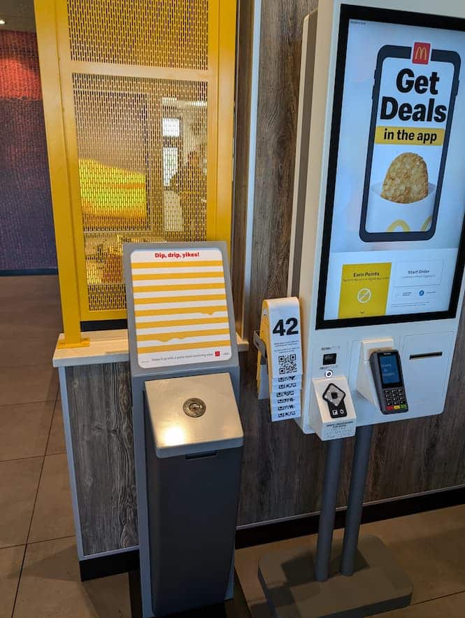 - A McDonalds cash kiosk welcomes you with a self-ordering touchscreen featuring a special offer. Nearby, find a digital card reader, a ticket dispenser showing number 42, and a hand sanitizer dispenser for your convenience.