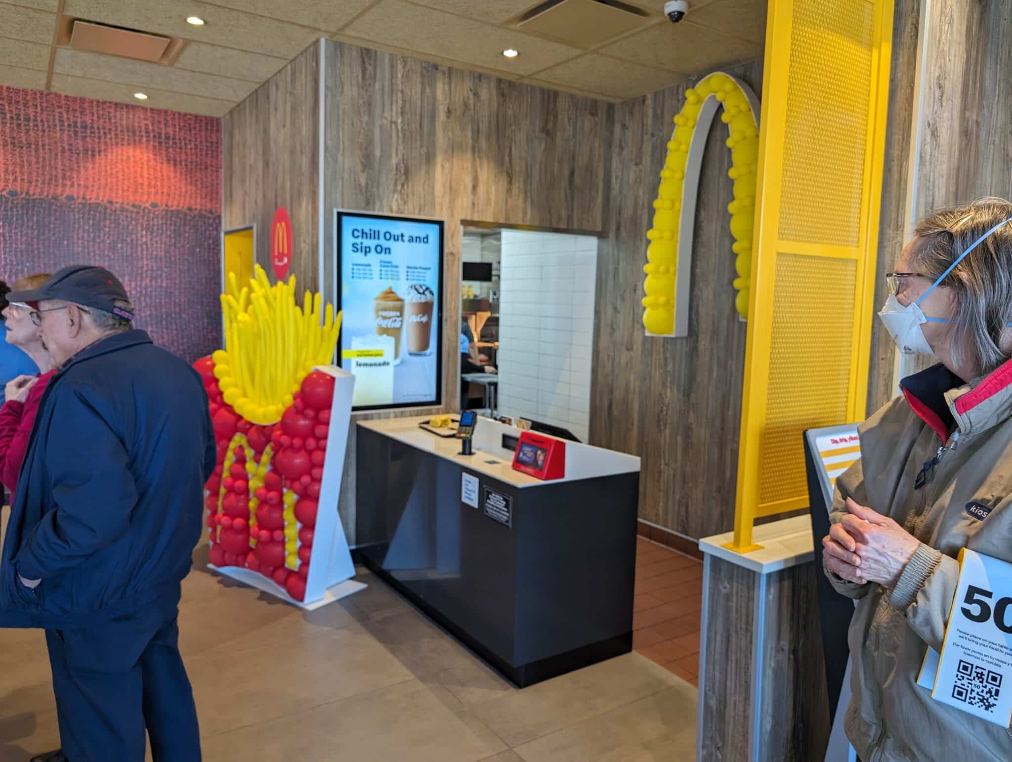 - Inside a McDonalds featuring counterless service, people stand in line amid decor that includes a large yellow arch and red balloons shaped like fries. A digital menu displays drinks with the slogan Chill Out and Sip On. On the right, a woman wearing a mask waits patiently.