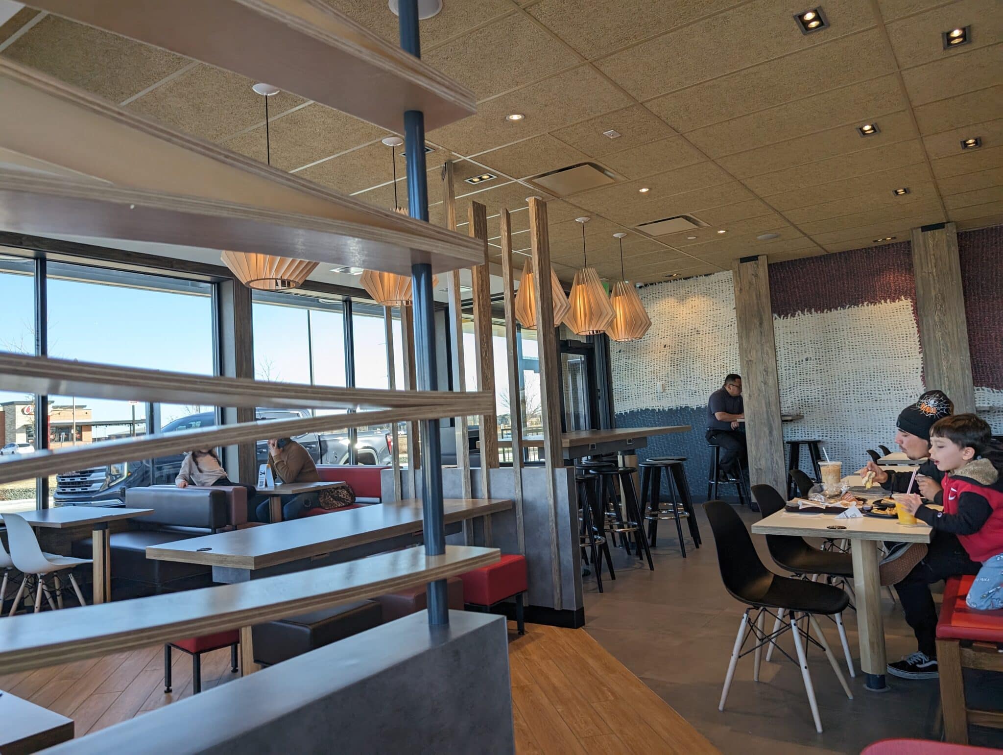 - A modern, counterless fast-food restaurant with wooden furniture and pendant lights. Some people are seated at booths and tables, eating and chatting. Large windows provide natural light, creating a bright and welcoming atmosphere reminiscent of McDonalds new design ethos.