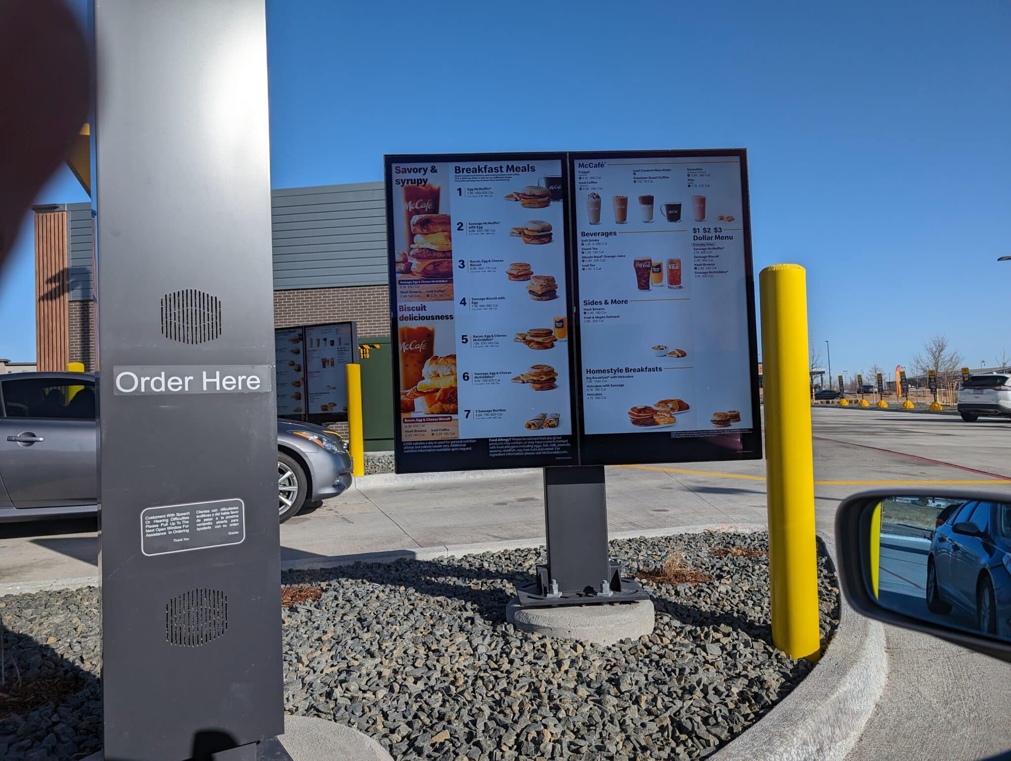 - A drive-thru menu board at the fast-food restaurant showcases breakfast items, meals, and drinks. A car waits nearby to order in this counterless McDonalds experience, as bright yellow bollards stand beside the menu in the sunny outdoor setting.