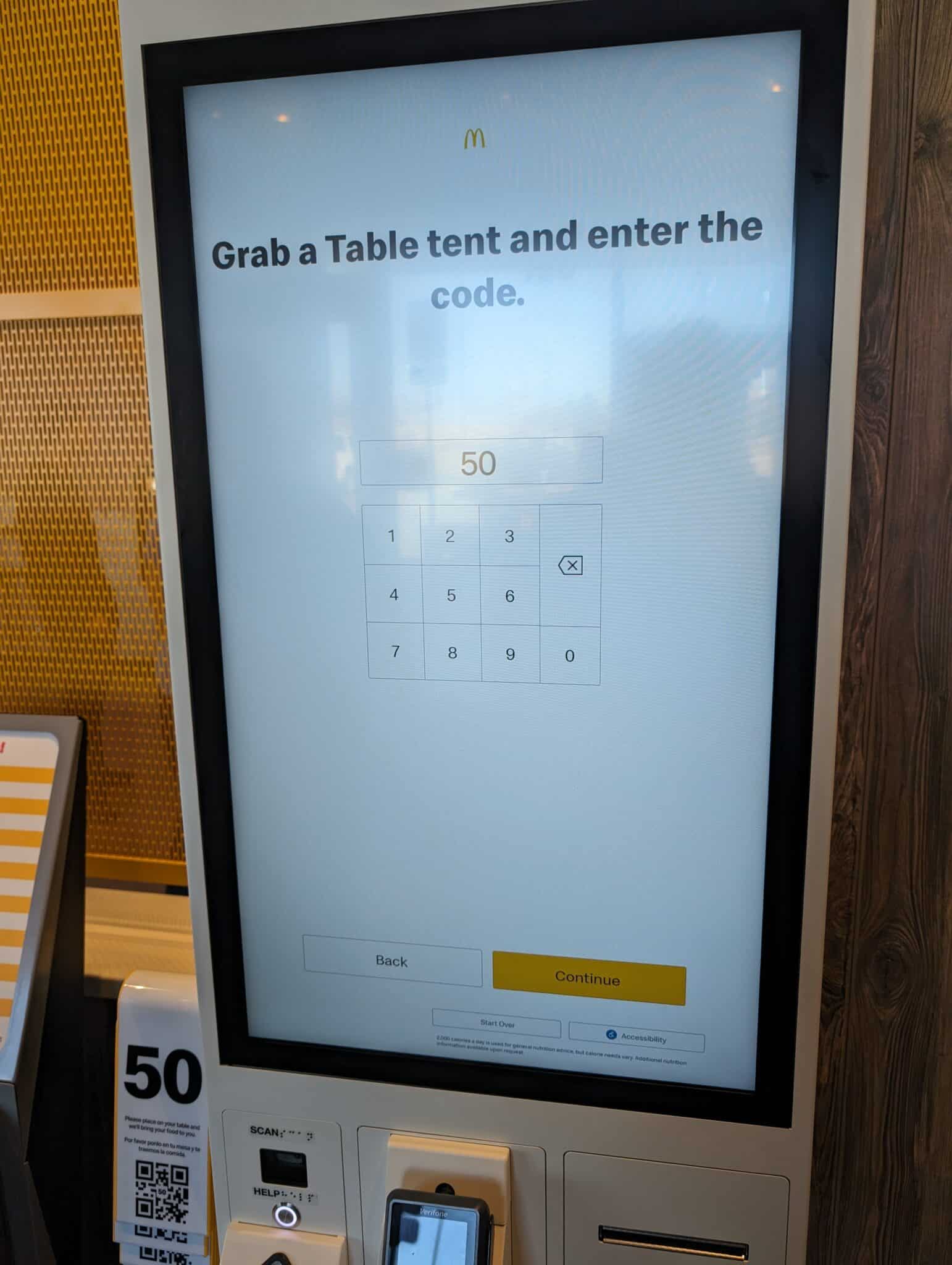 - On the McDonalds counterless self-service kiosk screen, text reads Grab a Table tent and enter the code. A numeric keypad shows the number 50, with Back and Continue options below. A QR code and card reader are located at the bottom for seamless transactions.