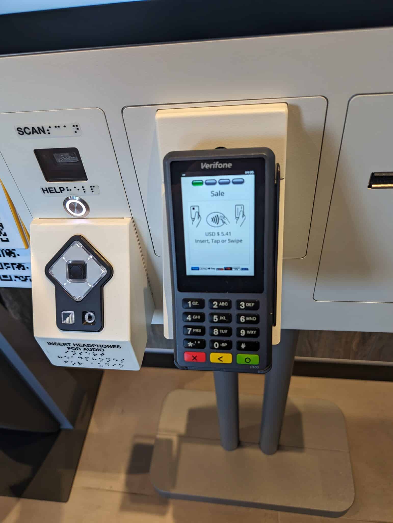 - At a McDonalds counterless setup, a credit card payment terminal shows a $5.41 charge. You can insert, tap, or swipe your card. Nearby, another device features a fingerprint sensor and help button for seamless transactions.