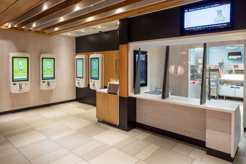 - The interior of the modern fast-food restaurant features McDonalds kiosks wall-mounted on the left and a counter with a transparent partition on the right. Above, a digital screen displays instructions. Light wooden and black finishes create a clean, contemporary look, reminiscent of their drive-thru efficiency.