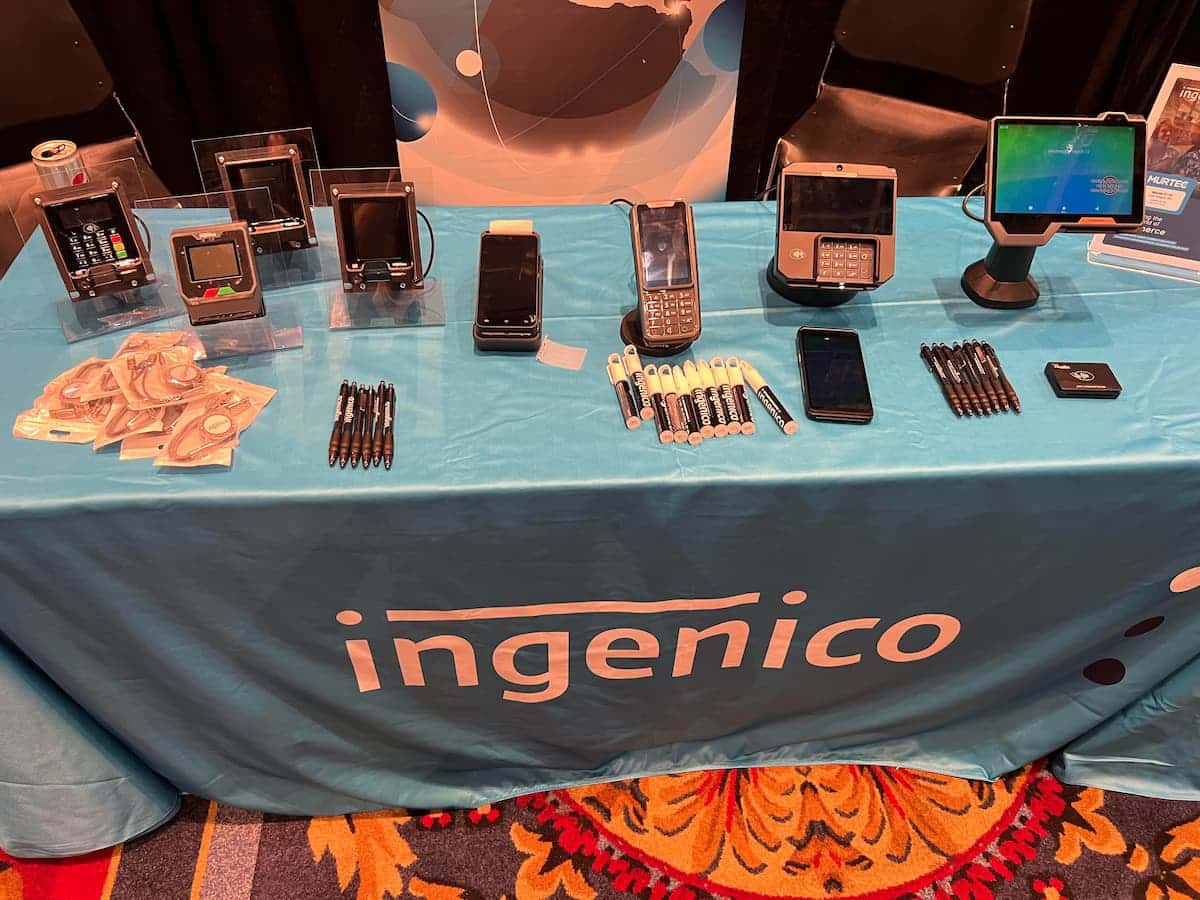 - A table draped in a blue Ingenico cloth showcases an array of electronic payment devices, including card readers and touchscreen tablets, alongside pens and promotional items. This lively scene unfolds at MURTEC, capturing the essence of innovation at a bustling trade show.