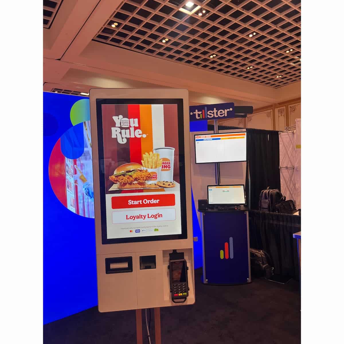 - The interactive ordering kiosk at the Murtec trade show showcases a fast food menu with Start Order and Loyalty Login options. In the background, booths and screens create a vibrant event atmosphere beneath a patterned ceiling.