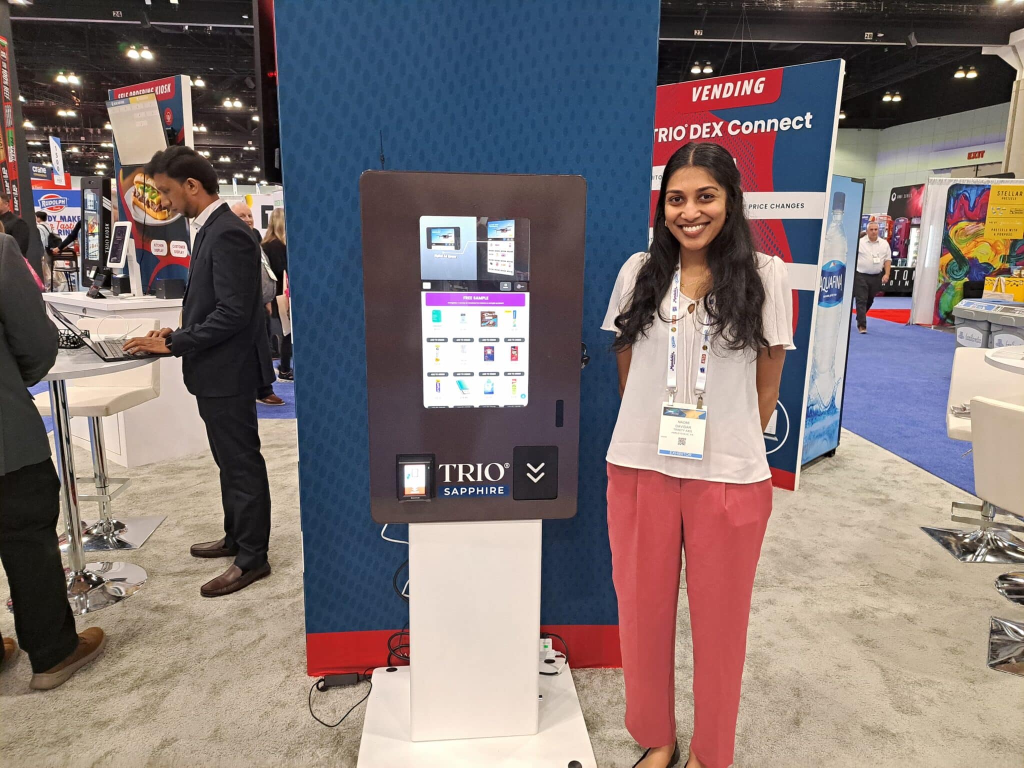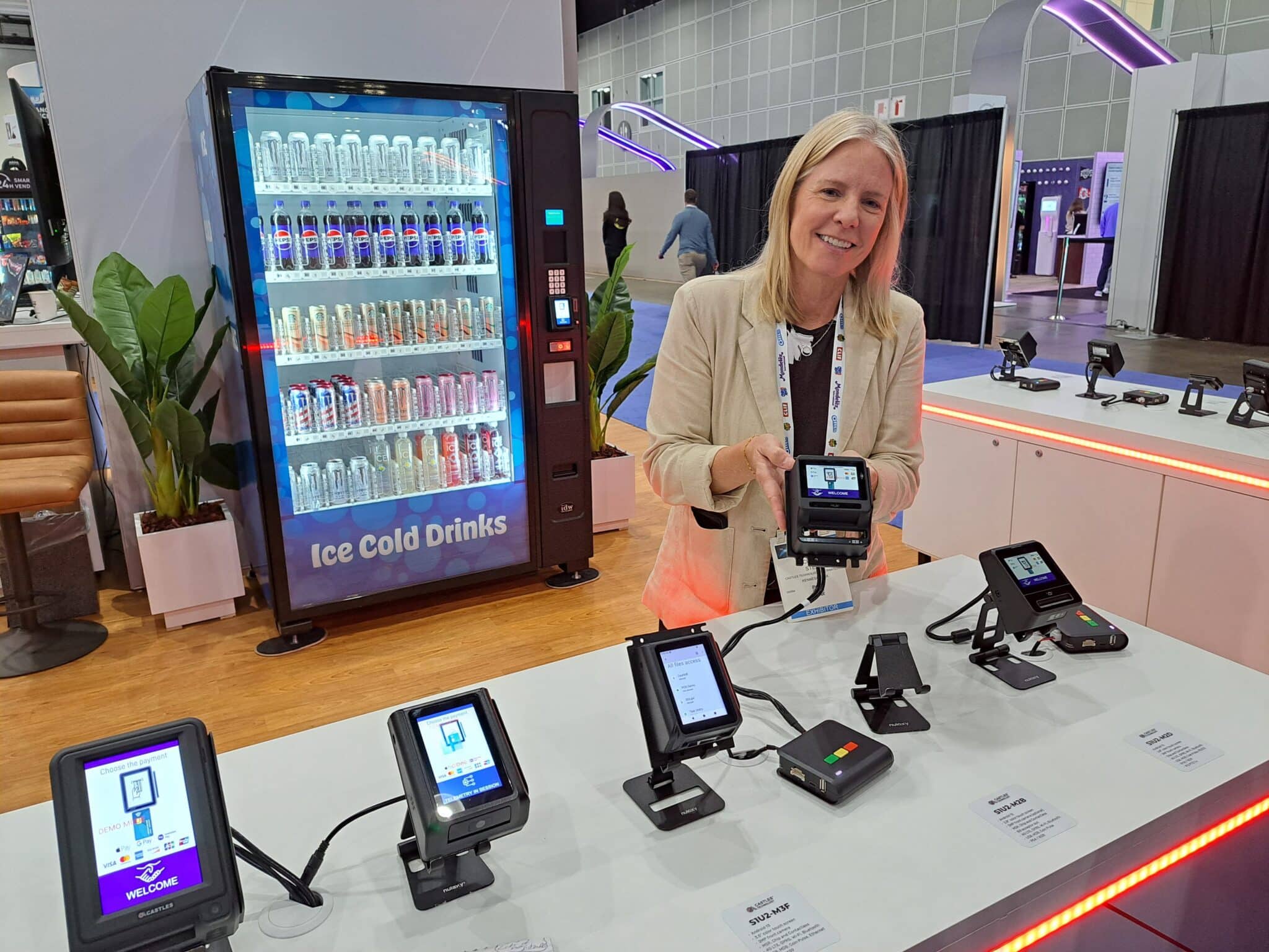 - Hanna Davies demonstrates the VendCore Pro at the Nayax Ltd. exhibit.