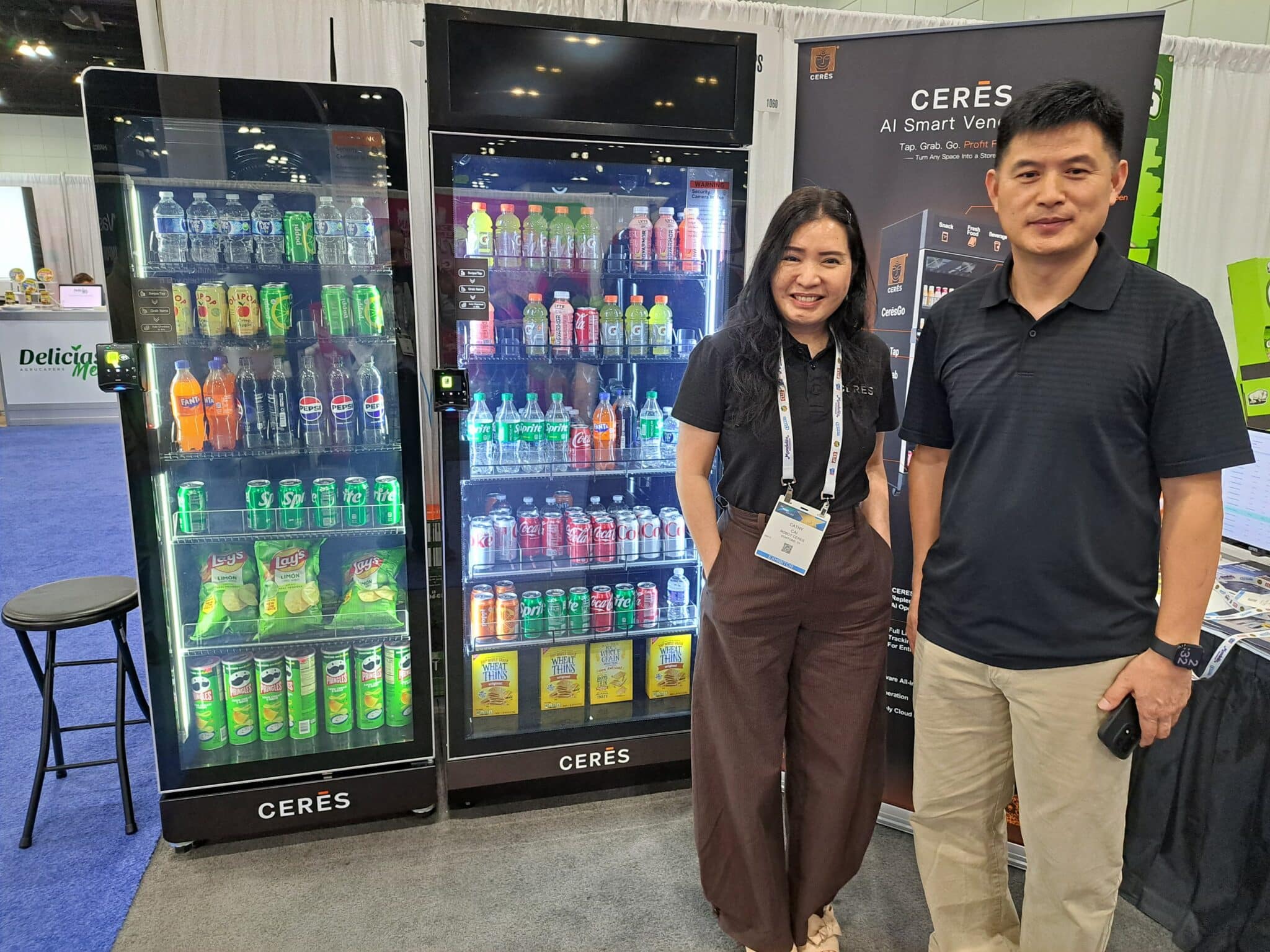 - Cathy Cai and Michael Zhao introduce the AI powered vending machines at the Ceres exhibit.