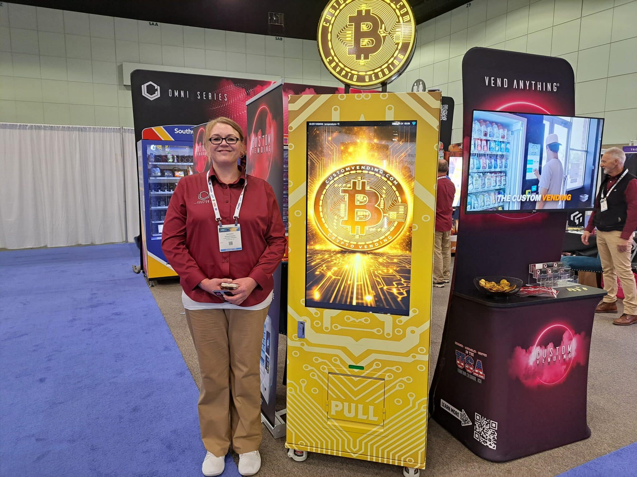 - Amanda Woodward introduces the OMNI vending machine that allows cryptocurrency payments at the Custom Vending exhibit.