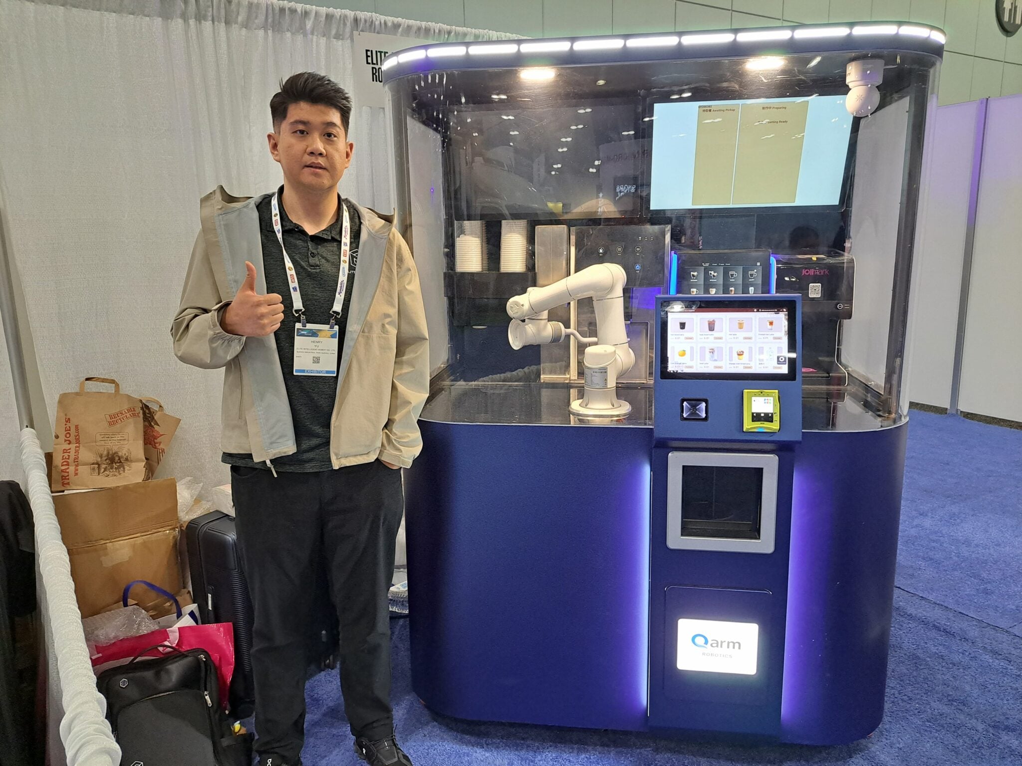 - Henry Yu demonstrates the RoboticBarista at the Elite Robots exhibit.