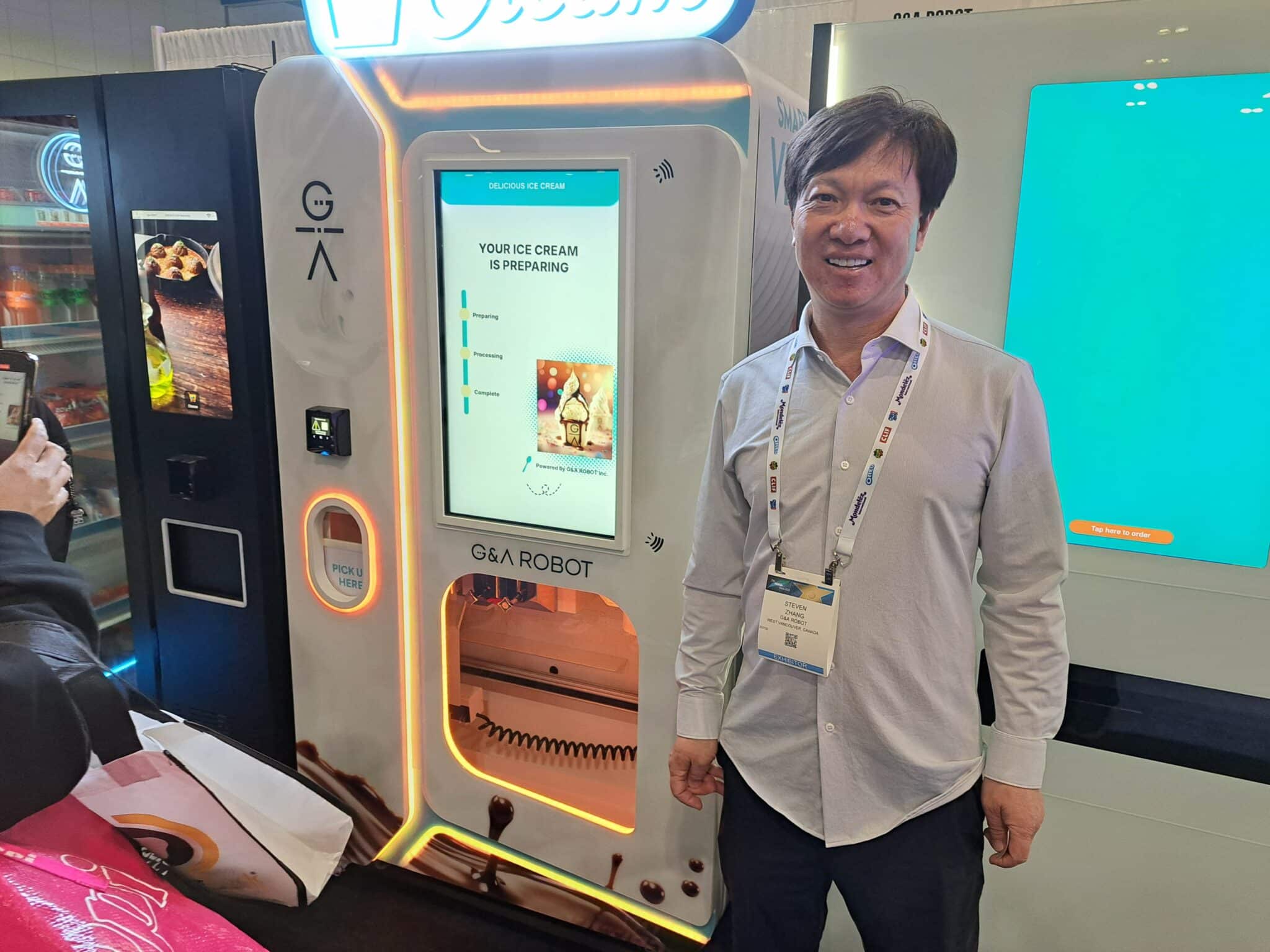 - Steve Zhang serves ice cream to attendees at the G&A Robot exhibit.
