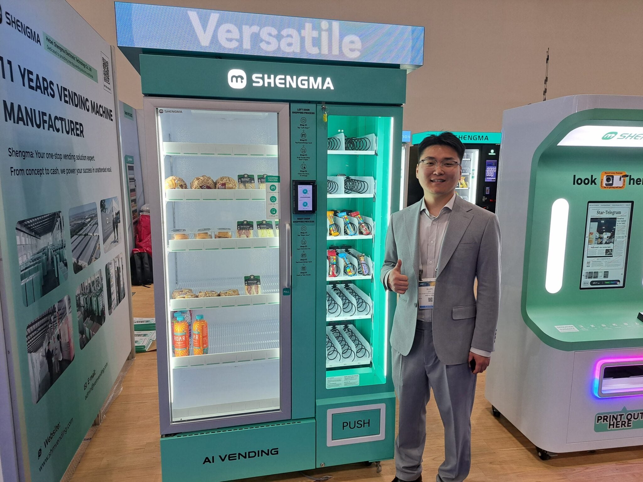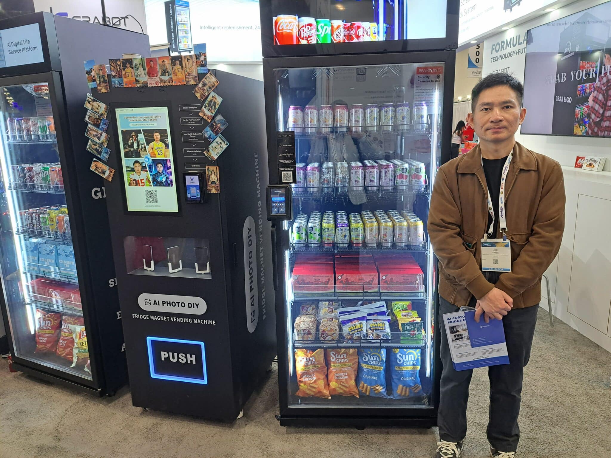 - Allen Liu introduces the Duo Hybrid AI Vending Machine at the Shengma exhibit.