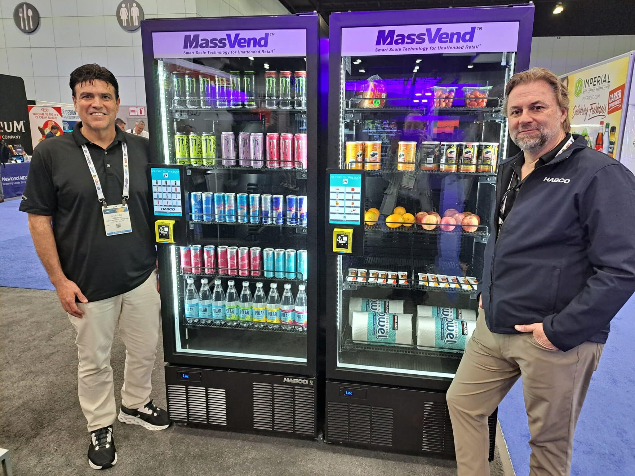 - Laurence Langell and Chris Strong show the Massvend autonomous retail system at the Habco Manufacturing exhibit.