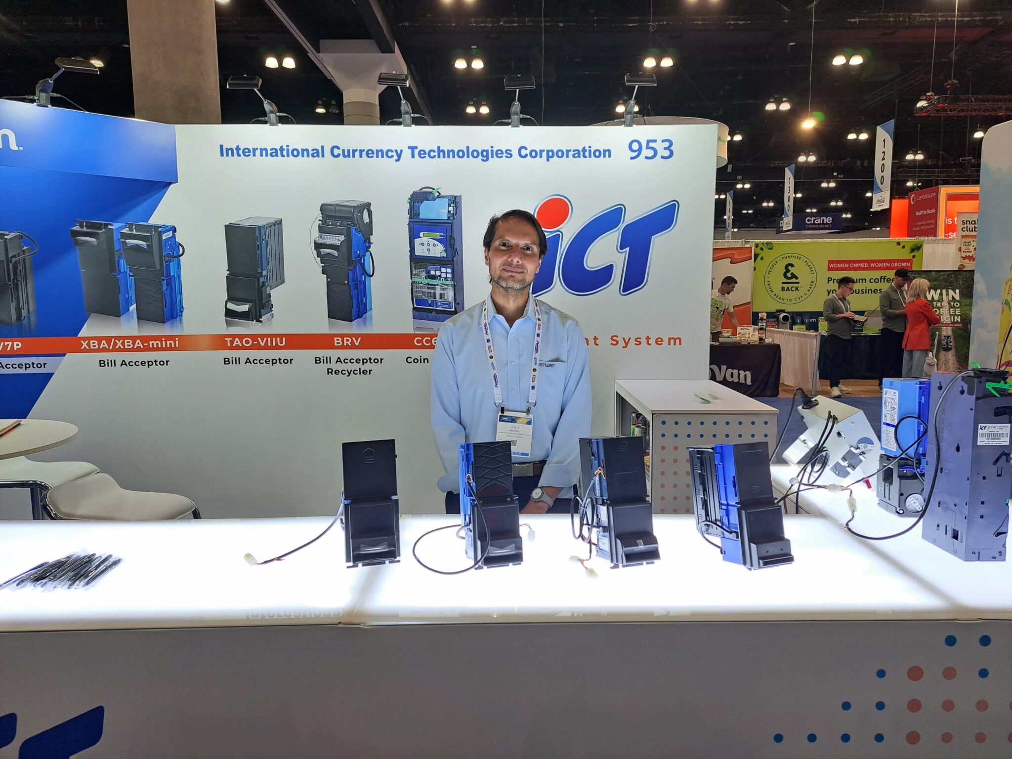 - Italo Amaral shows bill acceptors at the International Currency Technologies (ICT) exhibit.
