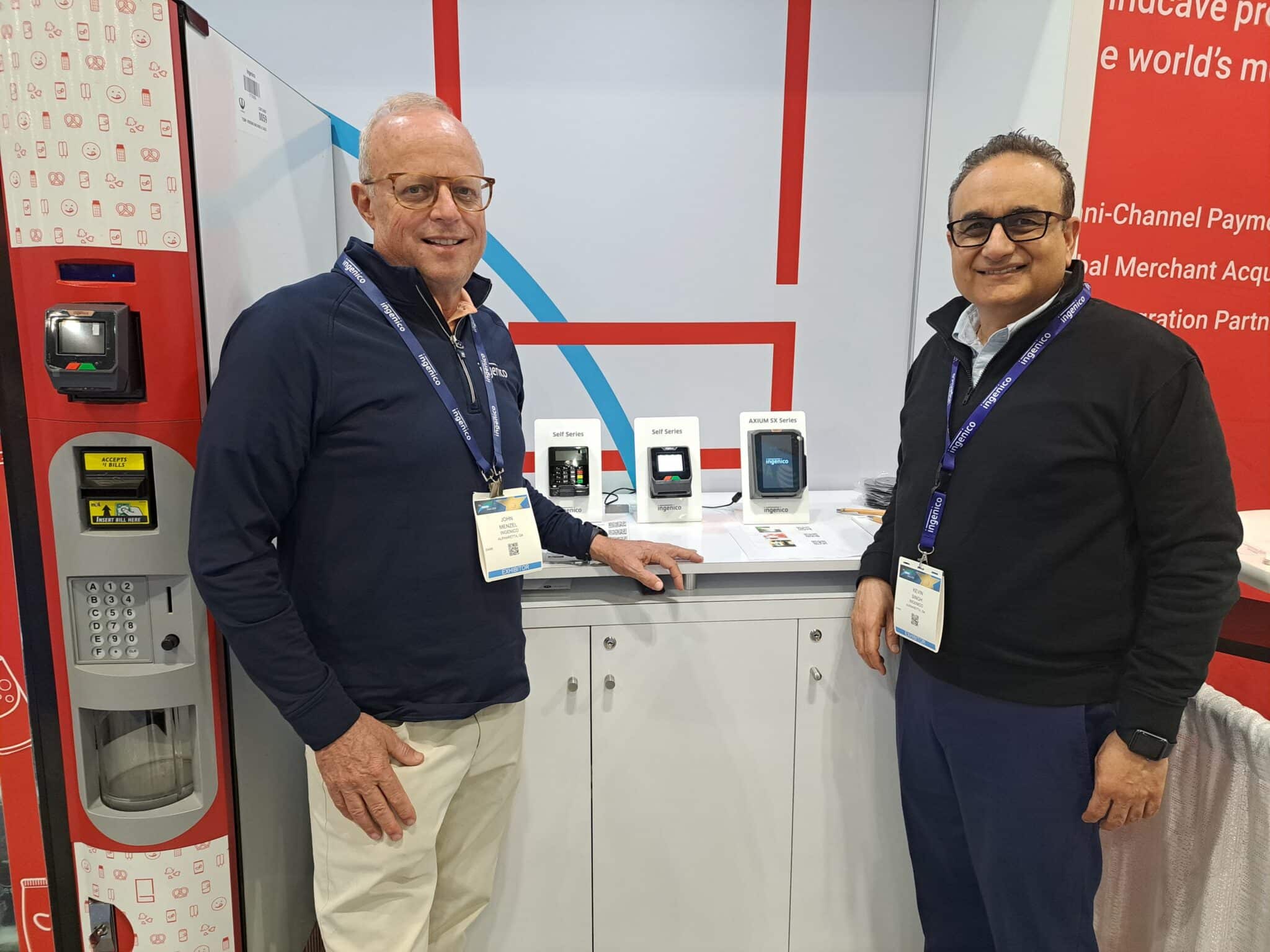 - John Menzel of Ingenico and Kevin Singh of Gimme present the Axium SX Series at the Ingenico exhibit.