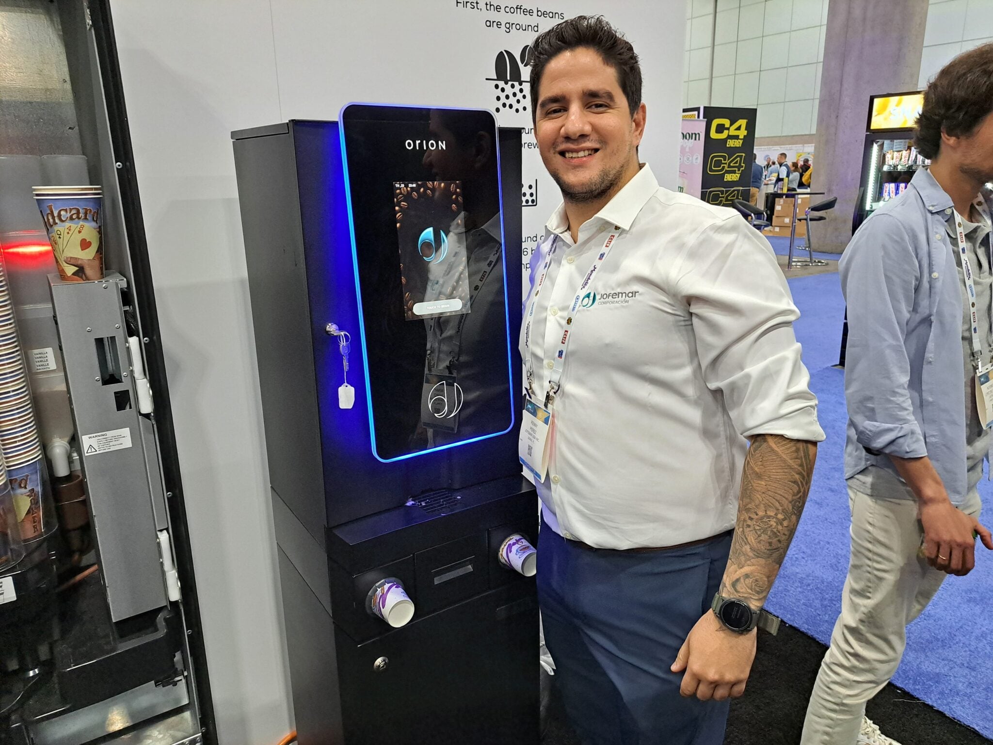 - Remy Perez shows the Orion Touch coffee machine at the Jofemar exhibit.