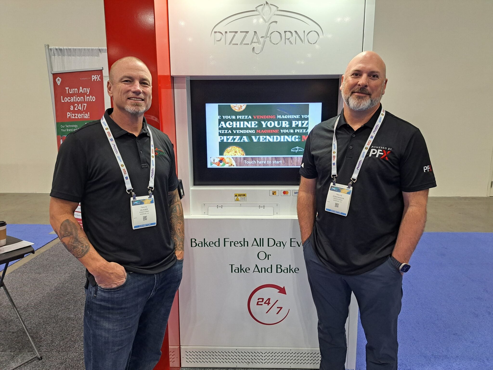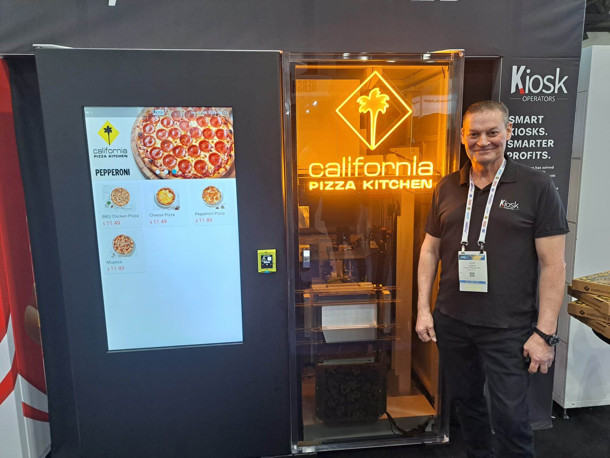 - John Laspia presents the California Pizza Kitchen machine at the Kiosk Operators exhibit.