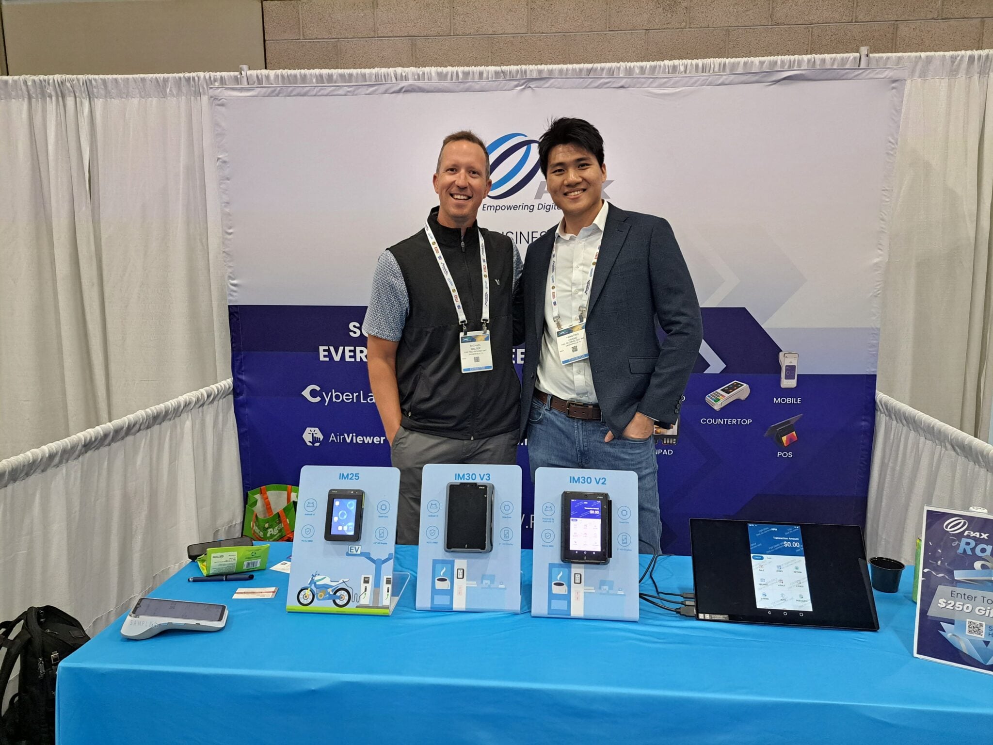 - Michael Walters and Yongting Huang show payment equipment at the PAX Technology exhibit.