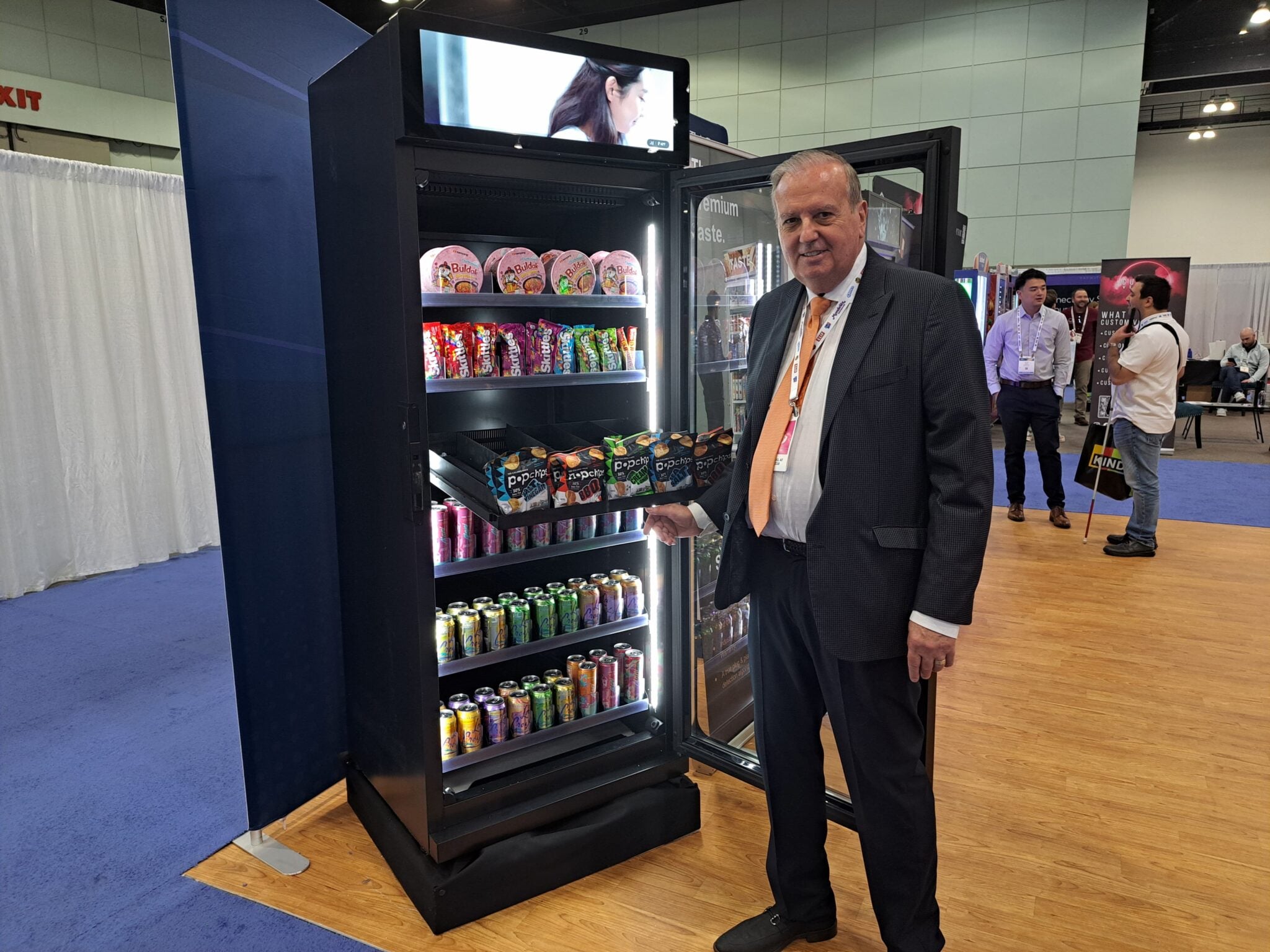 - Michael Hutchins displays the new micro market self-serve kiosk at the Televend exhibit.