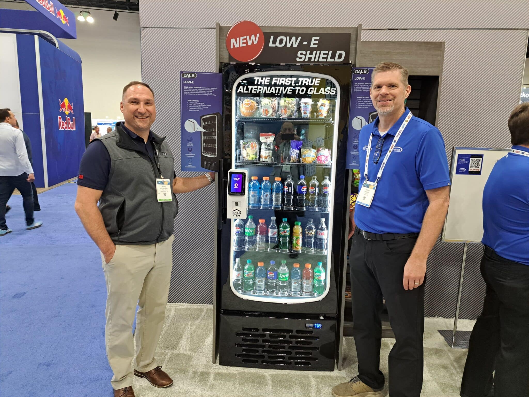 - Bobby Weatherholtz of Dalb Inc. and Dennis Hammer of Seaga Manufacturing Inc. introduce the Low E-Shield door for traditional glassfront machines at the Seaga Manufacturing Inc. exhibit.