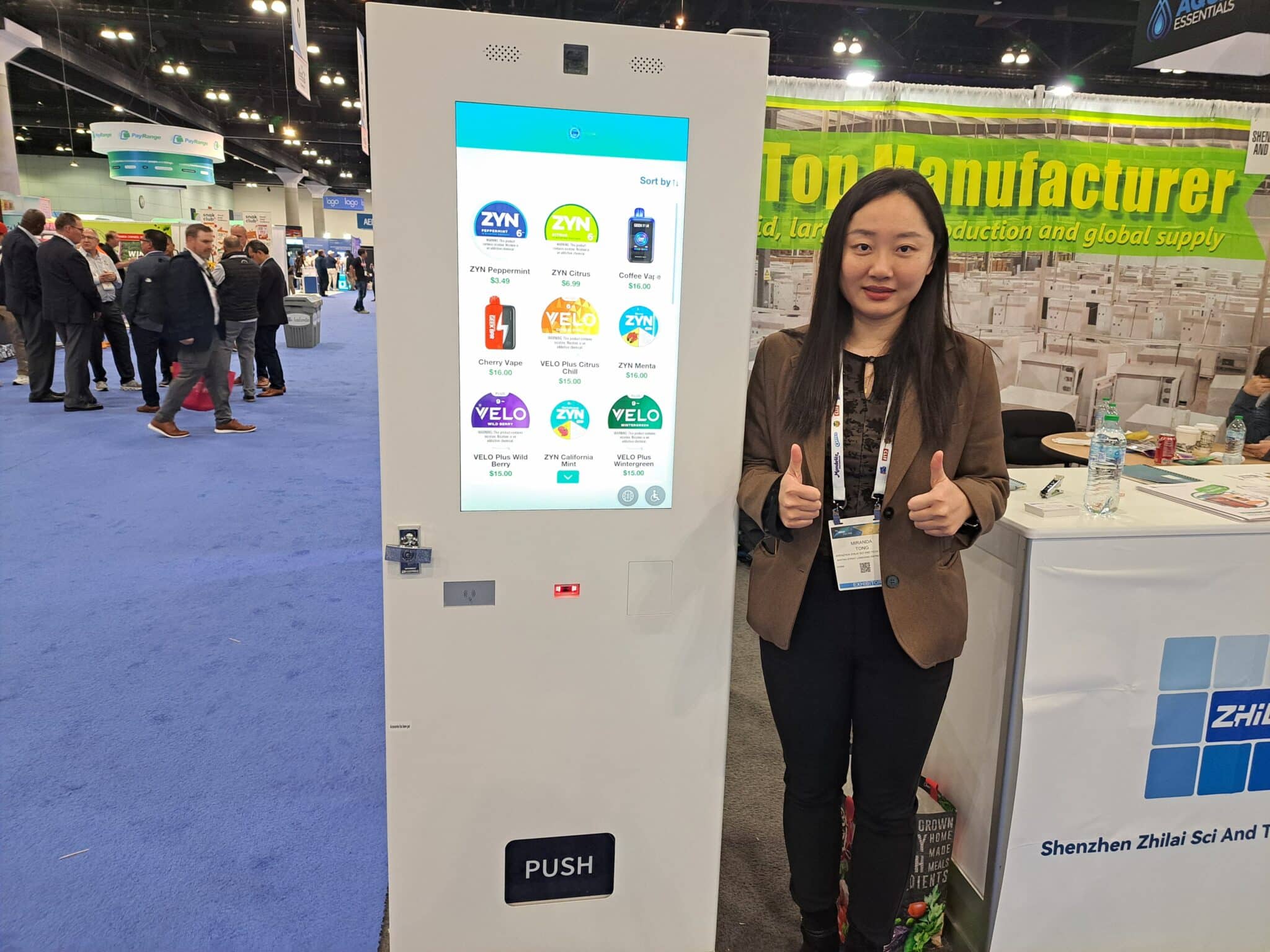 - Miranda Tong presents the vape vending machine at the Shenzhen Zhilai Imports Co. Ltd. exhibit.