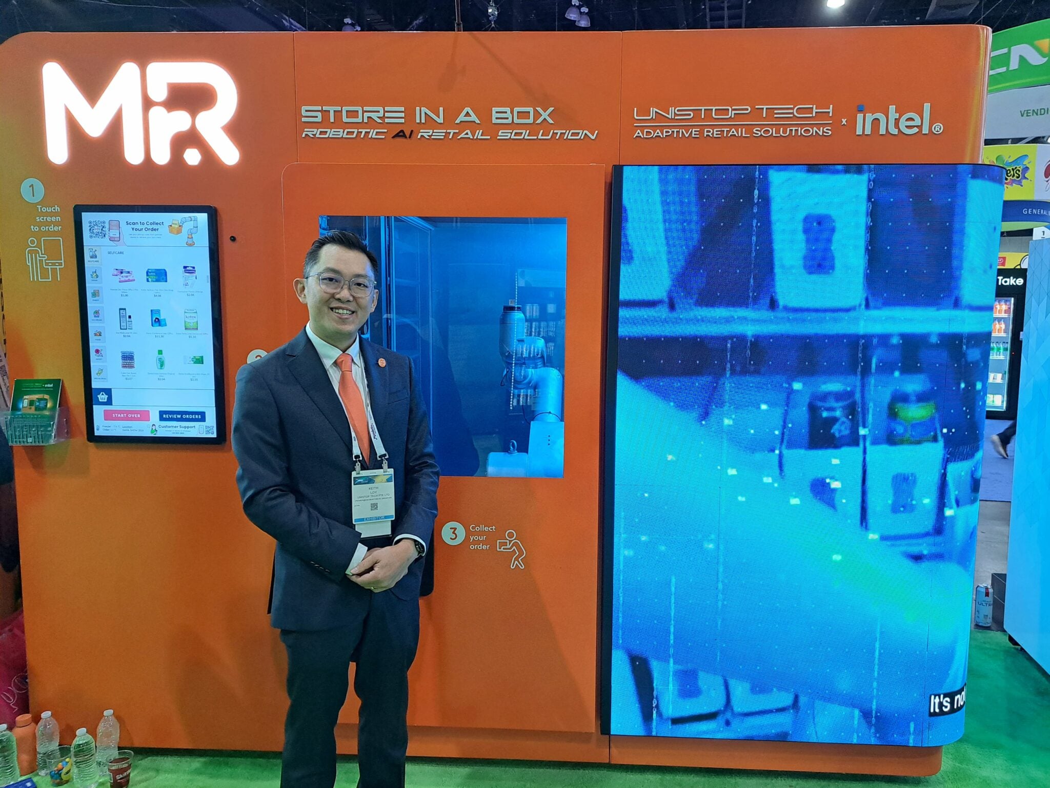 - Keith Loy demonstrates the Mr. AI-Powered Autonomous Retail Solution at the Unistop Tech exhibit.