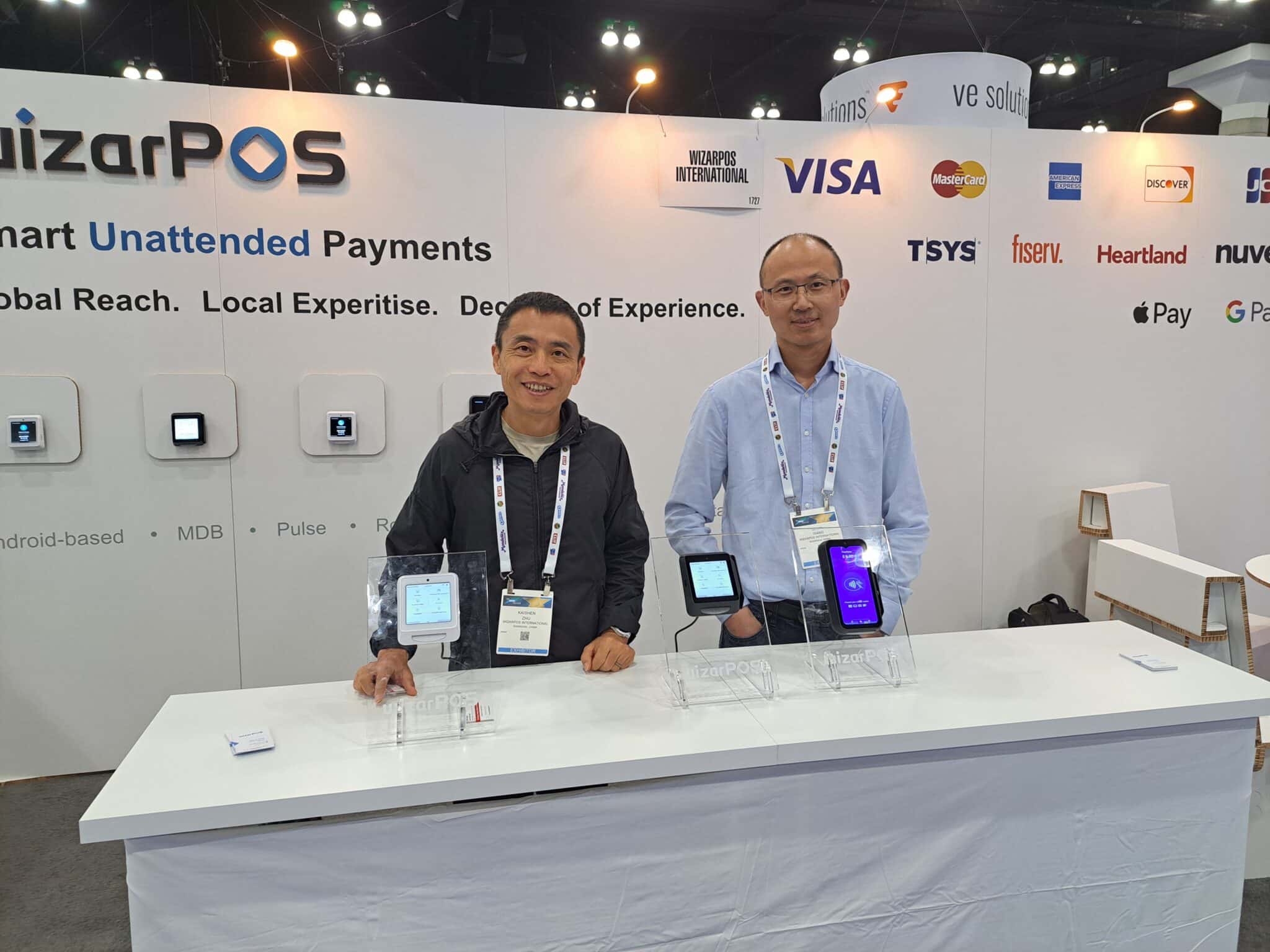 - Kaishen Zhu and David Wang introduce Android POS payment solutions at the WizarPOS exhibit.