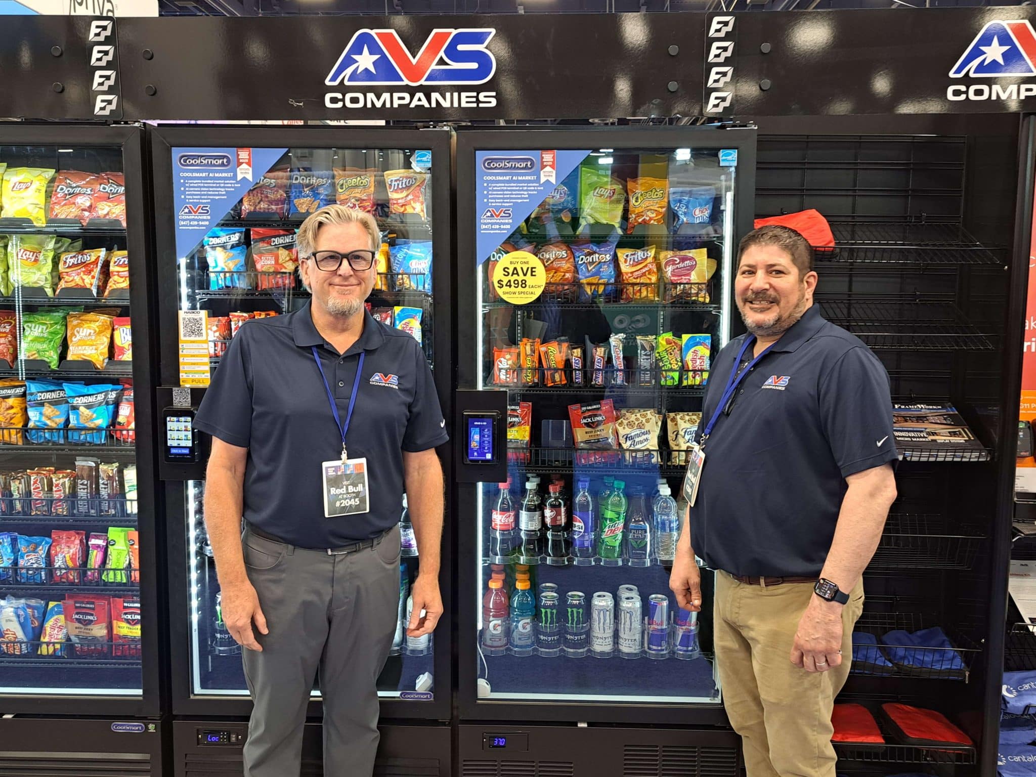 - Two men in AVS Companies shirts smile in front of snack and drink vending machines at a trade show booth, showcasing Vending Automation at NAMA. The machines are stocked with chips, candy, sodas, and water bottles.
