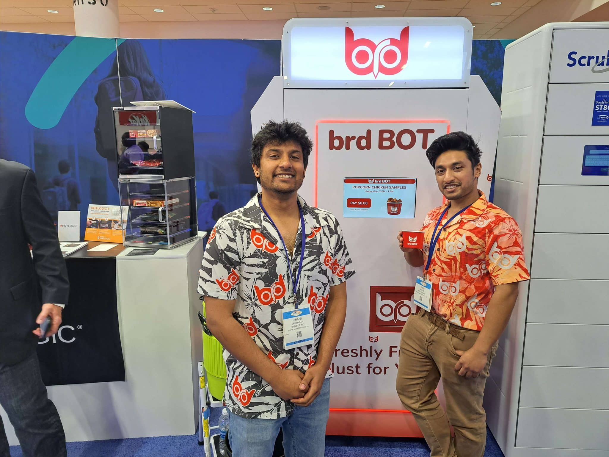 brd Bot, a hot food vending machine manufacturer, presented its closed front robotic kiosk that heats and serves flash frozen fried food in two minutes. Offerings include french fries, chicken nuggets, mozzarella sticks, egg rolls and samosas.