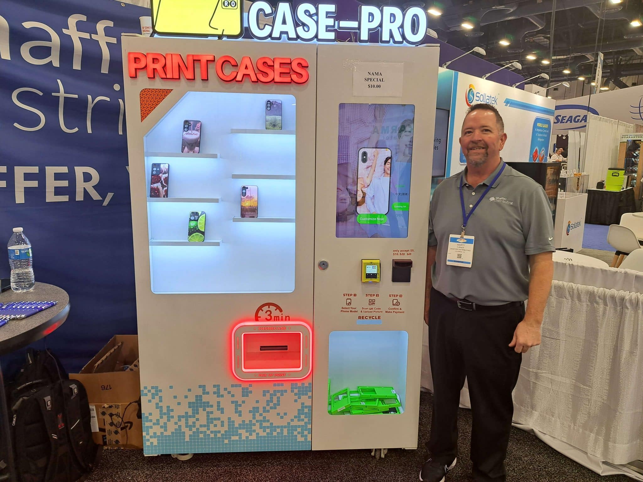 - A man stands smiling next to a PRINT CASES vending machine, showcasing Vending Automation at NAMA. The brightly lit machine dispenses custom phone cases at a trade show booth, featuring an eye-catching digital display screen.