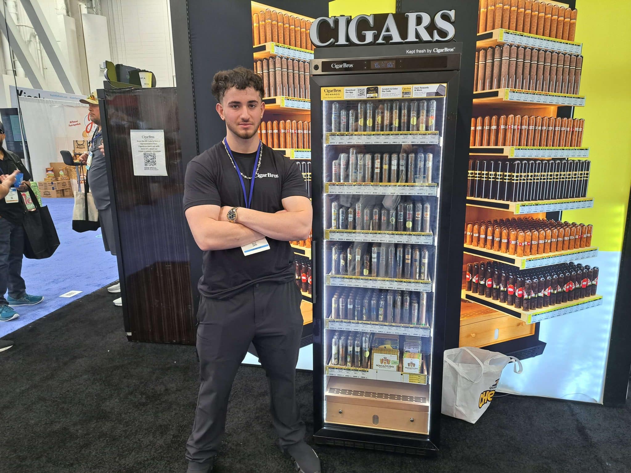 - A man with curly hair and a black outfit stands with arms crossed in front of a cigar vending machine and display shelves at an indoor event, highlighting Vending Automation at NAMA. The vending machine has a CIGARS sign on top.