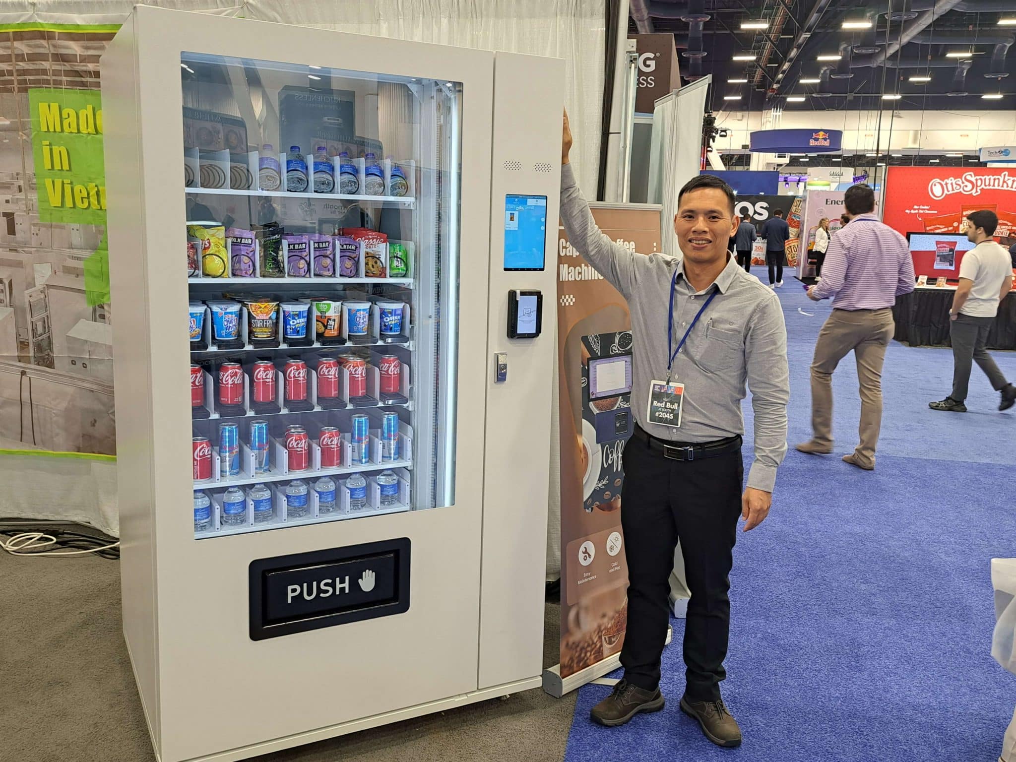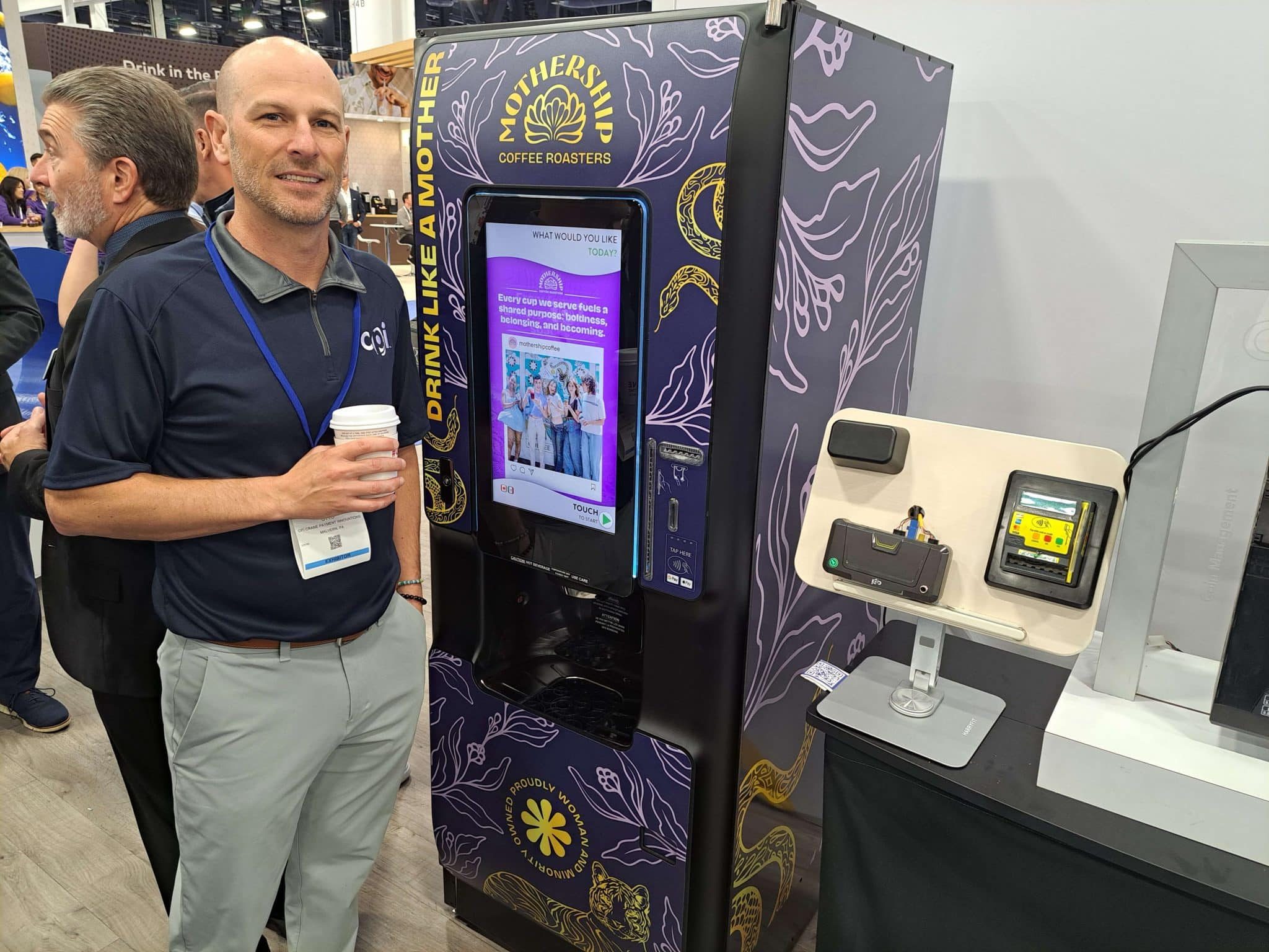 - A man with a conference badge stands beside a vending machine featuring “Drink Like a Mother,” showcasing Vending Automation at NAMA, with a large screen displaying an app and convenient payment devices attached to the side.