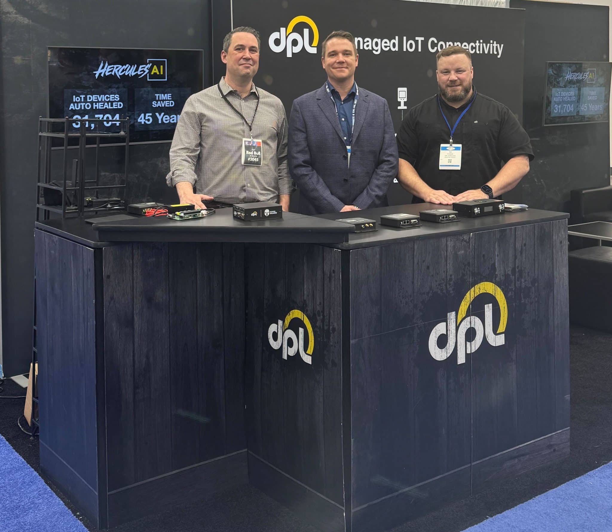 - Three men stand behind a black booth with the dpl logo at a trade show, highlighting Vending Automation at NAMA. The backdrop reads Managed IoT Connectivity, with devices and promotional materials displayed on the counter.