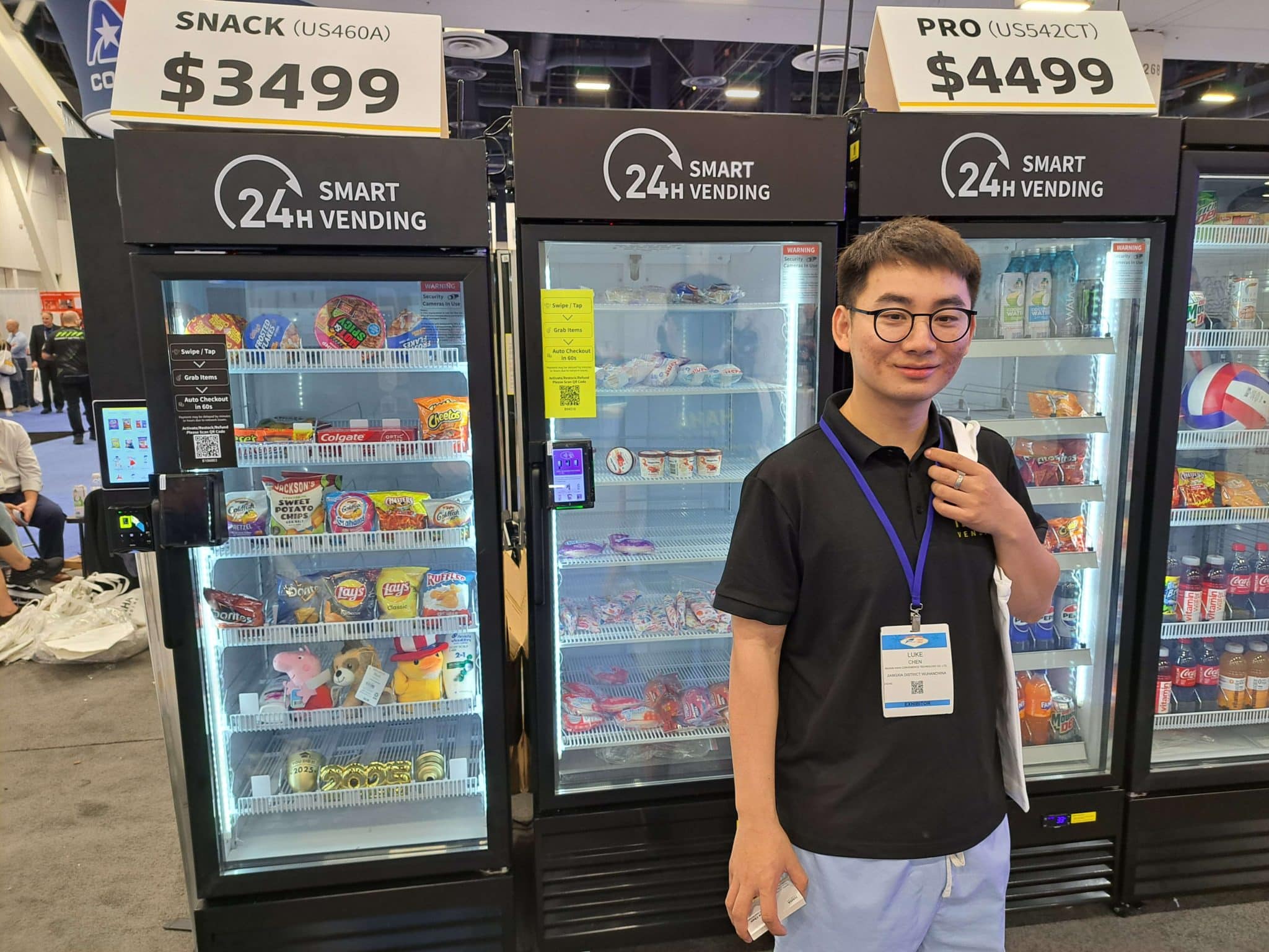 - A man with glasses and a lanyard stands smiling in front of two 24-hour smart vending machines at an indoor event. Showcasing Vending Automation at NAMA, the machines are filled with snacks and drinks, with prices displayed above.