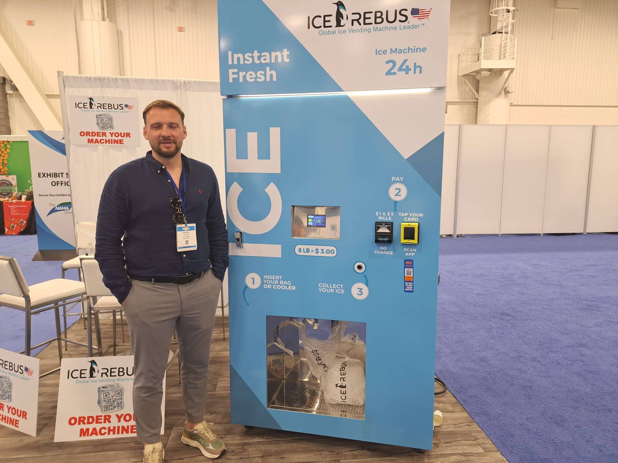 - A man stands next to a blue ICE REBUS vending machine labeled Instant Fresh ICE, showcasing vending automation at NAMA. The machine features a digital screen and payment slot, set within an indoor expo with banners and chairs in the background.